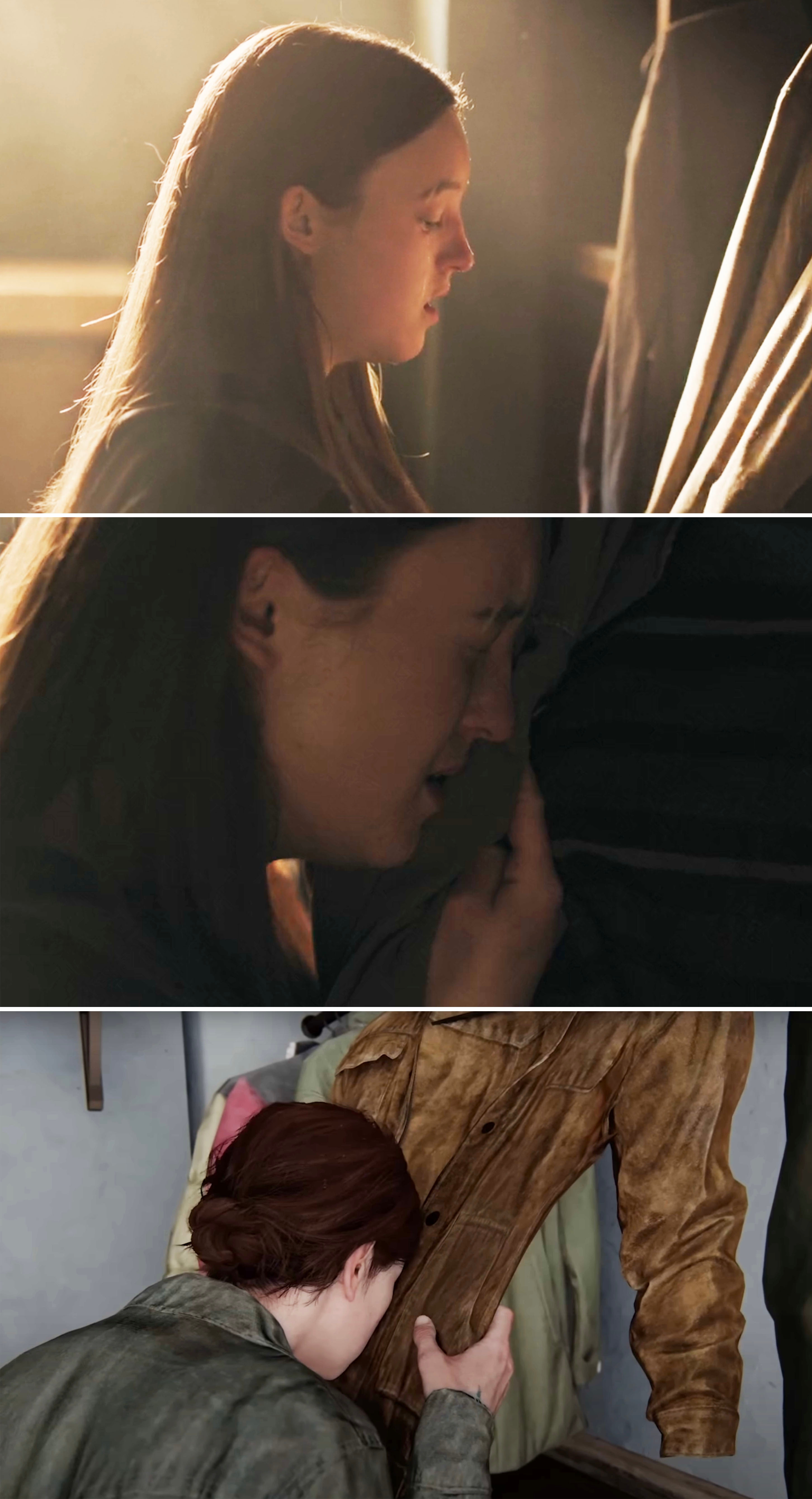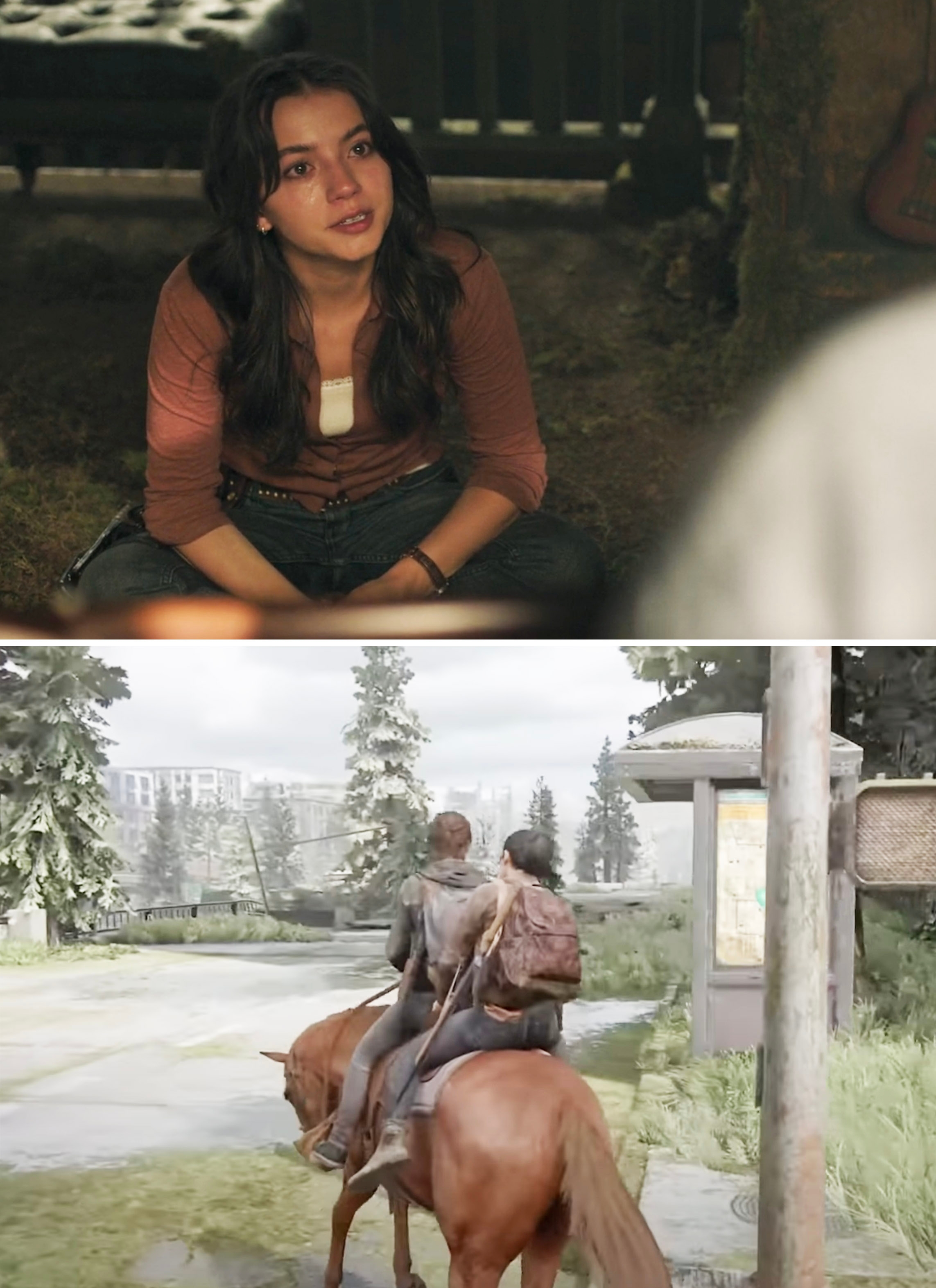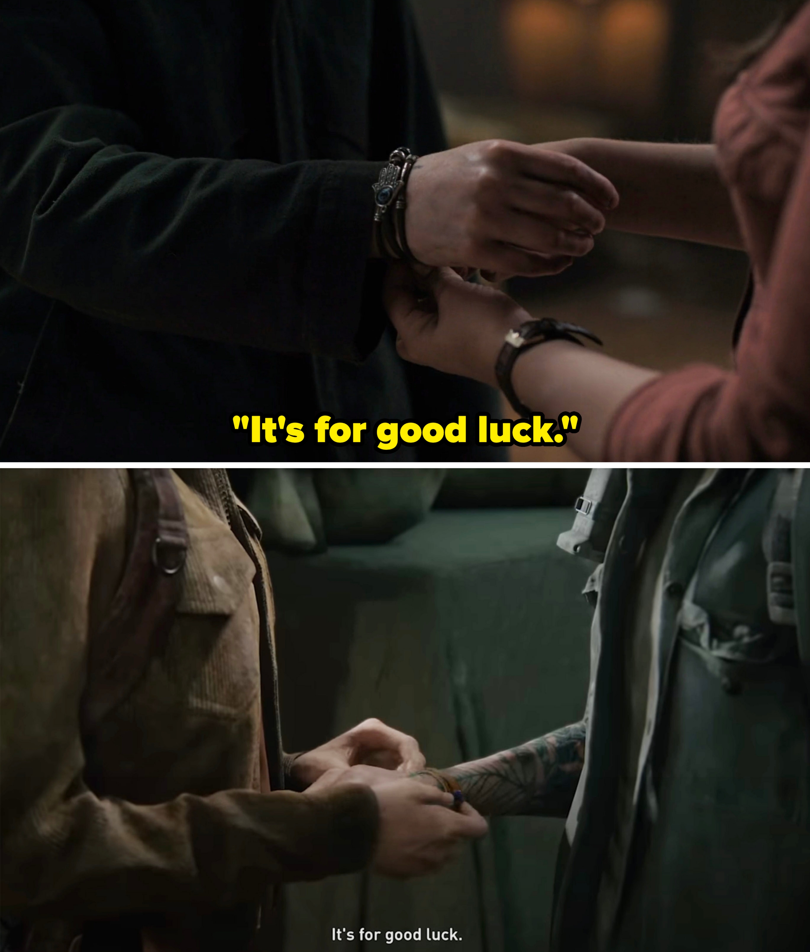One change in Joel's costume design from "The Last of Us" Season 1 to Season 2 is that he tucks his shirts in now "like a dad would." There are obviously MASSIVE spoilers ahead for The Last of Us Season 2! She continued, saying, "They have such a great understanding of these characters, so it's always important to me to hear what they have to say and give them a voice in the fitting room. There's always wonderful conversations to be had with the cast." The tucked-in shirts are also meant to mirror Tommy, who is also a dad and leader in Jackson. Ann explained, "Tommy is the pillar of the community now, and sort of in charge with Maria, and Tommy's always got his shirts tucked in." Ann explained, "The jacket was really the only piece from Season 1 that made it. I felt like that was an iconic character piece to Joel, and it's something that the audience was going to remember." "When we saw in the script that it was going to be a jacket, we knew it had to be THAT jacket," Ann added. "Seeing that progression in one episode from Ellie as a 14-year-old turning 15-year-old teenager to a 19-year-old young woman," she continued. "So the pants are baggier, the T-shirts are longer and a little bit baggier. Then, as Ellie starts to grow up and become an adult, the jeans are a little slimmer in shape, the T-shirts are shorter in the body, even the hem on the T-shirt is a little bit shorter, and the silhouette of the shirts that she wears is also a little bit slimmer. So it's little things like that that help to show that age progression." She added, "I felt it was really important to show, like, the similarity between Joel and Ellie in their clothes and the things that they choose." Ann added, "I wanted there to be a sharp contrast between the two." Ann added, "When we knew it was going to be the Converse, that's when I went to Craig Mazin [the show's co-creator], and I said, 'I would really love to have some doodles on the shoes, and I would love to give a pair to Bella, see what they would do with them.' And he was also on board with that idea." She continued, saying, "I felt like it wasn't really, in a weird way, I know this is going to sound strange, but it kind of didn't feel like it was my business. It felt like as long as it was true to who Ellie was for Bella, then I was fine with it. It became something very personalized that Bella got to do with their costume." Ann also joked, "I mean, listen, as a costume designer, when I see that in the script that Ellie is wearing Converse in the snow, I'm like, this is just me as a costume designer, I'm like, 'Really?!'" She continued, saying, "That scene is so gorgeous, and it's right out of the game. I really felt it was important to try to stay as true to not only the colors that the characters were wearing in the game, but also the silhouette. This is an iconic look for Ellie, and we want it to stay as true to that iconic look as possible." Speaking about working with the props department on creating the iconic bracelet, Ann said, "I knew Nevin [Swain, prop master for Season 2] was a genius when it came to creating these props. So he had somebody who built the bracelet for us. I loved this bracelet. When I was starting prep on the show early, early on, I remember having a conversation with my friend's 16-year-old daughter, and she said, 'You have to promise me, Aunt Ann, that Dina's bracelet is going to make it into the show. Just please promise me.' And I was like, 'Okay, I promise it will.'" She continued, saying, "So it was really important to me to make sure I got that right for Noah because she was so passionate about it. Of course, it's a big part of the story as well, so there was no way it wasn't going to make it into the game, but the fact that Noah brought that to my attention made it even more special to me." She added, "My team, my breakdown team, who are all incredible artists, hand-screened the stripes onto a T-shirt." She said there were discussions about the fact that Aviator Nation didn't exist prior to the outbreak in The Last of Us. She said, "We discussed the fact that the Aviator Nation did not exist in our timeline. But as Craig and Neil have always said, it's all about serving the story, and what serves the story best, just like the Pearl Jam song 'Future Days.' That serves the story, doesn't matter if it was in our timeline or not. We had similar discussions about this jacket. It just felt like Dina." She continued, saying, "We wanted to try to find that perfect green that would look great in the forest, that would separate her enough so that you can see her. But also, so she kind of blends in a little bit, because that makes sense for who Ellie is." Explaining how the costume department made the jackets, Ann said, "We found the fabric. We stripped the fabric, overdyed the fabric, splayed into the fabric, and then the fabric goes to the workroom. They build the shell. Then, when the shell is done, it goes back to breakdown, where they wash it down to get those really great faded edges." She continued, saying, "Then it goes back to the workroom, where it's waterproofed, and then all the other things are added, like the fake fur that we used on the hood. Then once it's built completely, it goes back into breakdown for its final aged look, where they add dirt and grime and anything else that might need to go on there to make it look 20 years old." Ann recalled, "In the game, everybody's wearing lightweight jackets. I remember having this conversation with Ashley Swidowski, who's one of the game designers at Naughty Dog, and we talked about it, and we were like, 'This is great for the game, but not great in real life. So we're going to have to make these changes.' So everybody got parkas." Ann elaborated, saying, "We chose to go with a T-shirt here, just for practical reasons on set and for everything that was happening. Those were also larger conversations that we all had about, okay, this is what it was in the game, but we might