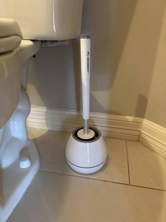 Promising review: "This is a very attractive toilet brush and holder. I’m glad I chose this one. The handle could be a little longer, but it doesn’t affect its performance. I’m not used to the rubbery bristles and feel like I’m not cleaning enough, but it does do the job. Simple to put together and lightweight. Overall, I am really pleased with it, and it looks nice in the bathroom. Would definitely buy again." —Ninx