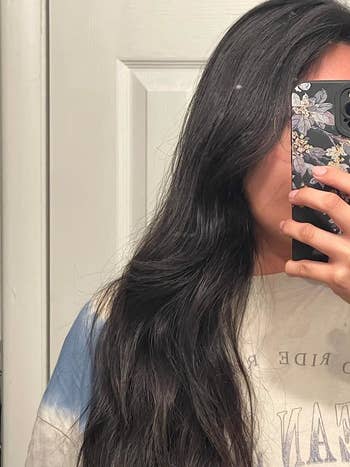 Promising review: "This is AMAZING, I've been searching for something to revive my hair (pictured above), and THIS PRODUCT IS IT. These results were literally after the first use. I’ve tried everything, and being in the military and always wearing a gelled-down and tight bun has been damaging my hair. I wish I’d known about this hair mask sooner!" —Casandra Retana