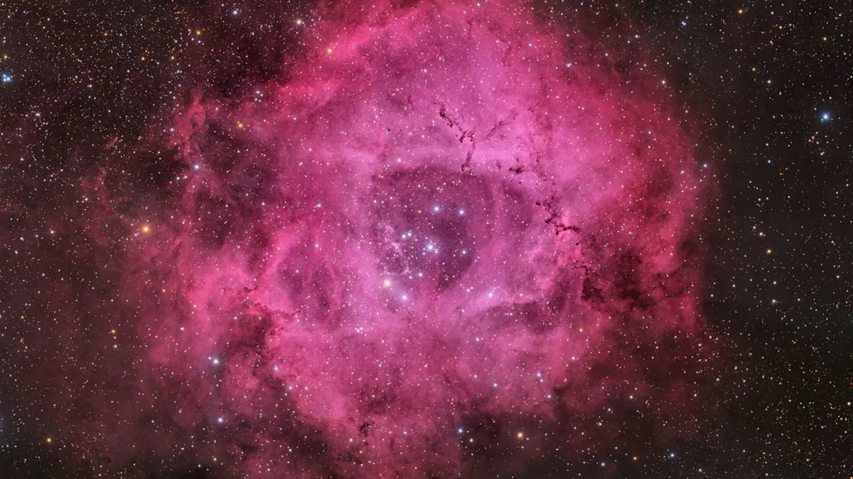 Dark filaments of hydrogen gas thread the scene, blocking the light of stellar giants beyond, while the blue-white stars of the open cluster NGC 2244 can be seen carving out the vast cavity in the heart of the vast nebula flower. Some of the stars in the cluster are true behemoths, 50 times the mass of our sun.