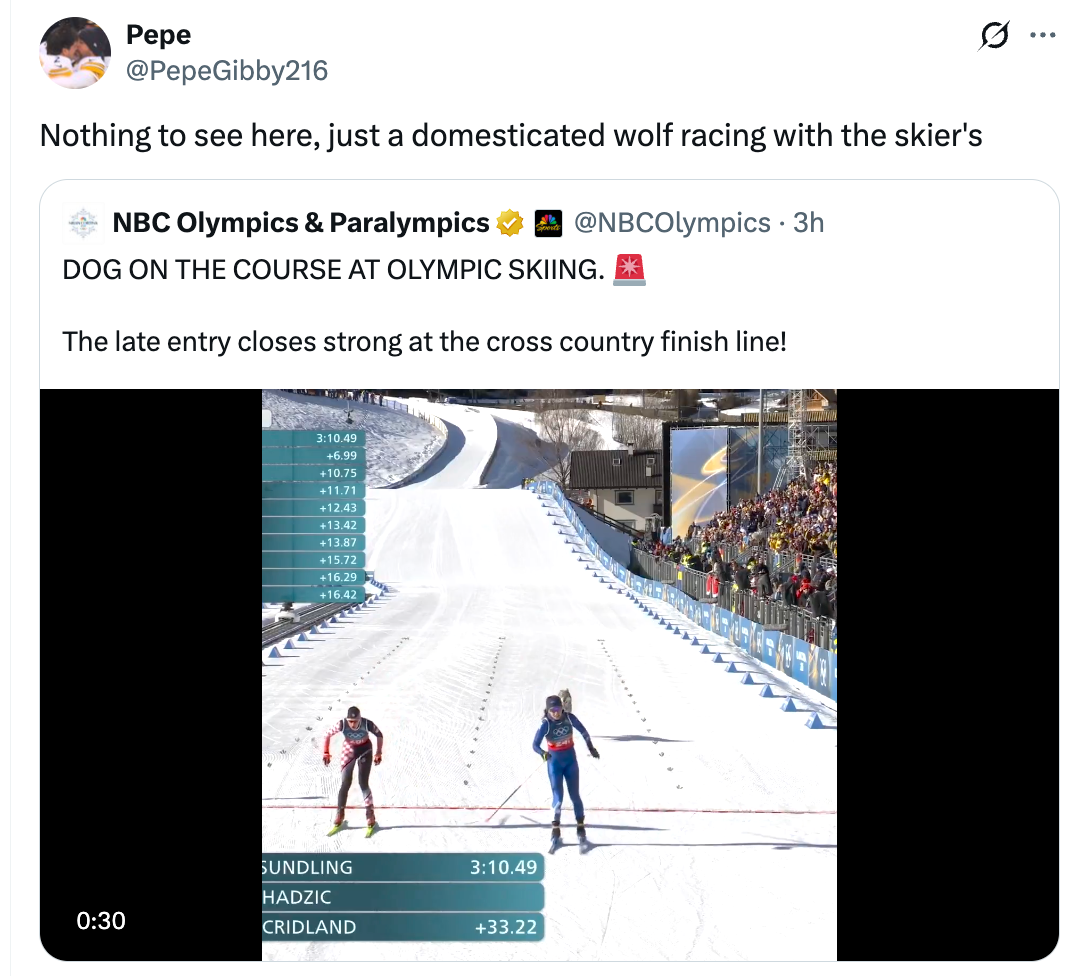 I truly can't believe this really happened. DOG ON THE COURSE AT OLYMPIC SKIING. π¨The late entry closes strong at the cross country finish line! pic.twitter.com/o4mO28tXXW