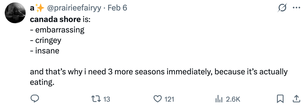 me outside paramount hq if canada shore doesn’t get a second season pic.twitter.com/QF8UnOGJYn