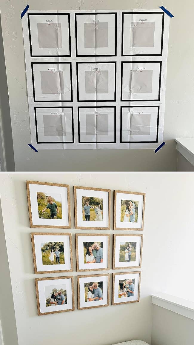 With that handy template, you could even drill the holes for the frames directly into the paper, or like poke a pencil through the paper to make the marks on the wall. (I'd use a hammer and nail, just because drills intimidate me.) How easy is that??