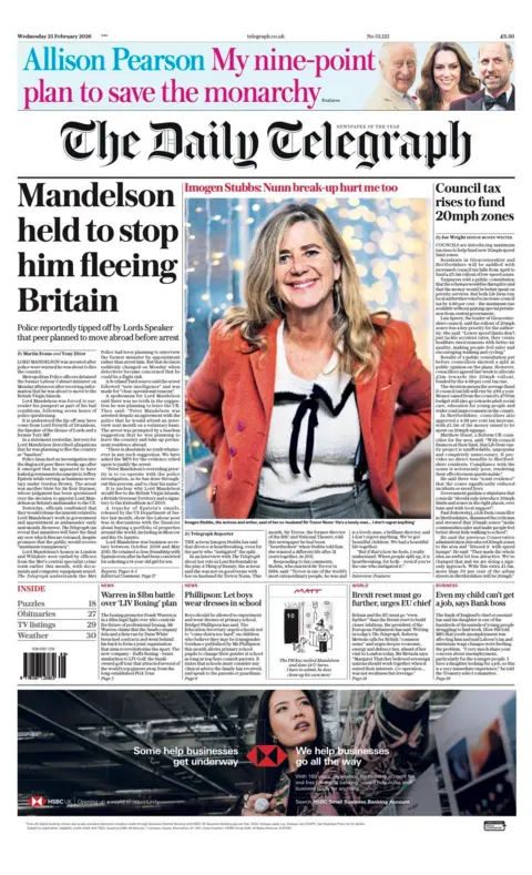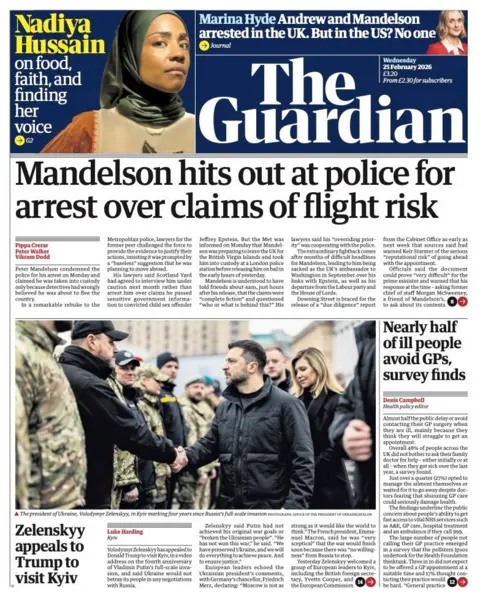 "Prince of Darkness" is a headline in the Daily Express as it has a picture of Lord Mandelson returning home after what the paper calls a "grilling" from the police. He was arrested on Monday on suspicion of misconduct in public office. According to the Times, officers had reportedly planned to interview the former cabinet minister under caution in a fortnight. But the Daily Telegraph says he was detained after officers received information he was about to move to the British Virgin Islands. Lawyers for Lord Mandelson have described allegations that he was going to flee the country as "baseless". The Sun reports that Andrew Mountbatten-Windsor has been given a riding ban. Royal aides reportedly fear him being seen grinning on horseback is a "bad look" while under investigation for allegedly leaking secrets to Jeffrey Epstein. "Get orf your high horse, Andy", is the Sun's headline. The Daily Express leads on a poll which suggests 48% of adults avoided or delayed contacting their GP about a health concern last year. The finding is based on a survey of 2,200 people. Reasons for putting off a visit included problems contacting surgeries and the expectation of not getting a suitable appointment time. The Guardian says the results "underline the public concern" about getting fast access to NHS services. The Financial Times features a photograph of Ukrainian President Volodymyr Zelensky leading commemorations in Kyiv on the fourth anniversary of Russia's full-scale invasion. The paper says while "most European nations sent either leaders or senior officials" there was no one from the Trump administration. The Daily Star's editorial strikes a sombre tone. "We pray," the paper says, "for an end to this conflict soon." And the Times notes that even though broadcasters are "tiring" of the obligation to read out all 11 candidates in the Gorton and Denton by-election, the situation "could be worse". The paper reminisces about the record 26 candidates who stood in Haltemprice and Howden in 2008. The list included the Church of Militant Elvis Party, the Miss Great Britain Party and the conspiracy theorist David Icke. Sign up for our morning newsletter and get BBC News in your inbox.