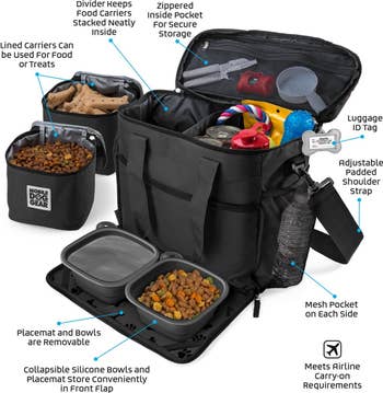Promising review: "Perfect size to carry all the essentials. The containers are removable and easy to clean. The bag is lightweight and not too big. In addition to food and treats, I can also take wipes, a hairbrush, a paw cleaner, a dental cleaner, and clothes. I highly recommend this bag!" —Ghyssella