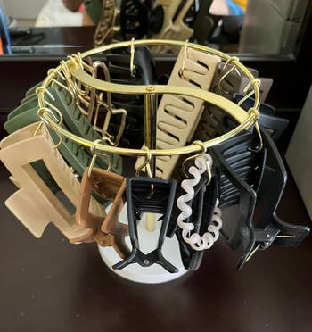 Promising review: "Very elegant stand that holds all of my hair claws (and then some) very easily. Material is light but sturdy, and looks great on my dresser. It freed up so much room, and makes it easy to access all of my claws at a whim. I even opened one of the hooks to hold my hair ties, so all my accessories fit on one device! I would love if the base could rotate, but that’s a minor inconvenience (and something I might DIY in the future). Overall, love the value for the product, and I highly recommend especially if you have a variety of sizes of hair claws."—Monique G.