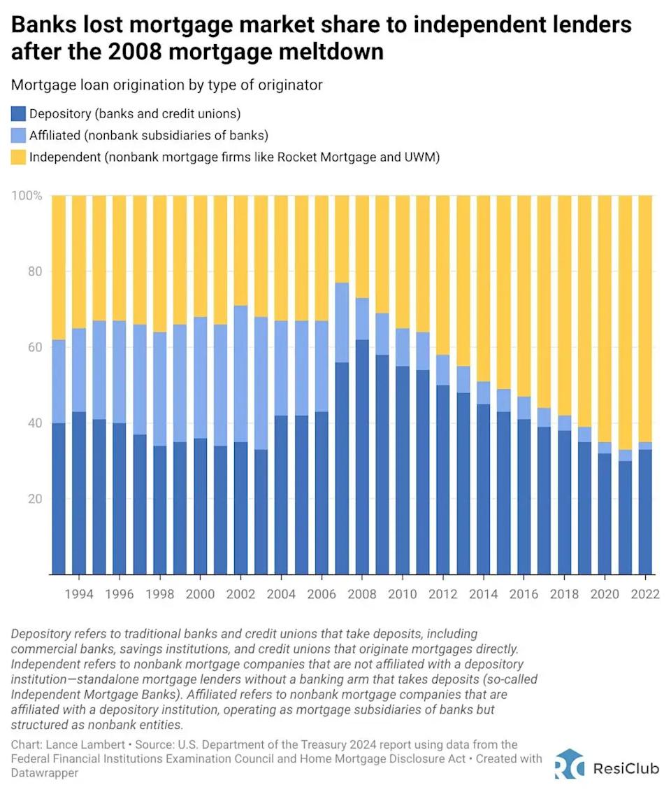 Want more housing market stories from Lance Lambert’s ResiClub in your inbox? Subscribe to the ResiClub newsletter. Most Read from Fast Company Inside the founder factory known as Palantir, America’s most polarizing company Jack Dorsey makes a grim prediction about the future of work as he lays off 4,000 Block employees in AI push Neuroscience says you can alter your brain structure to improve cognition. Here’s how—it’s already a popular hobby Since the 2008 housing bust and subsequent Great Financial Crisis (GFC), mortgage lending has steadily shifted away from big banks. In the years that followed—amid tighter regulations, higher capital requirements, and elevated litigation risk—many large banks, including Bank of America, JPMorgan Chase, and Wells Fargo, reduced their mortgage footprint. In that void, nonbank lenders, also known as independent mortgage banks (IMBs), such as Rocket Mortgage, United Wholesale Mortgage (UWM), and LoanDepot, gained market share. Now, a top Federal Reserve official is openly questioning whether policy and regulation went too far—and is signaling that a policy shift may be coming. In a February 16 speech at the American Bankers Association’s Community Bankers Conference, the Federal Reserve’s vice chair for supervision, Michelle Bowman, pointed to what she described as a “significant migration” of mortgage origination and servicing out of the banking sector over the past 15 years. According to Bowman: In 2008, banks originated around 60% of mortgages and held the servicing rights on about 95% of mortgage balances. In 2023, banks originated around 35% of mortgages and held the servicing rights on about 45% of mortgage balances. That’s pretty in line with the data ResiClub pulled from the U.S. Department of the Treasury. During her speech, Bowman suggested that post-2013 capital rules—particularly the treatment of mortgage servicing rights (MSRs)* under Basel standards**—may have contributed to the mortgage retreat by banks. MSRs, which represent the expected value of servicing income when loans are sold into securitizations, were assigned higher risk weights and subject to deduction thresholds after the crisis. While regulators tightened those rules over concerns about valuation volatility and model risk, the capital treatment also made servicing and, by extension, mortgage origination less economically attractive for banks. The result, Bowman implied, is a mortgage market increasingly concentrated in nonbank firms that lack deposit funding and operate under different supervisory and resolution frameworks. During the COVID-19 lockdowns, Bowman said, borrowers with bank servicers were more likely to receive forbearance than those serviced by nonbanks—highlighting structural differences that can matter during stress periods, she says. Bowman previewed potential changes now under consideration, including removing the deduction requirement for MSRs and making mortgage capital rules more sensitive to loan-to-value (LTV) ratios rather than applying a uniform risk weight. Such changes would not unwind post-crisis reforms but could modestly improve the economics of bank mortgage activity, Bowman says. Here’s what Bowman said in her February 16 speech: “Two regulatory proposals will soon be introduced that, among other broader changes to the regulatory capital framework, would increase bank incentives to engage in mortgage origination and servicing. First, the proposals would remove the requirement to deduct mortgage servicing assets from regulatory capital while maintaining the 250% risk weight assigned to these assets. We will seek comment on the appropriate risk weight for these assets. This change in the treatment of mortgage servicing assets would encourage bank participation in the mortgage servicing business while recognizing uncertainty regarding the value of these assets over the economic cycle. James Kleimann, founder of The Mortgage Scoop, writes in a recent newsletter: “This stuff is quite complicated, but basically, the Fed is weighing a plan to remove the rule that banks must deduct MSR assets from regulatory capital while maintaining a 250% risk weight for those assets. In plain English, that means regulators treat $1 of MSRs like $2.50 of risky assets. What the appropriate risk weight level should be remains the central question, but this potential change is something the MBA [Mortgage Bankers Association] has been arguing in favor of for years.” Big picture: If adopted, the proposals could mark the beginning of a gradual rebalancing in housing finance—one that brings more mortgage origination and servicing back inside the traditional banking system after more than a decade of migration outward. This post originally appeared at fastcompany.comSubscribe to get the Fast Company newsletter: http://fastcompany.com/newsletters