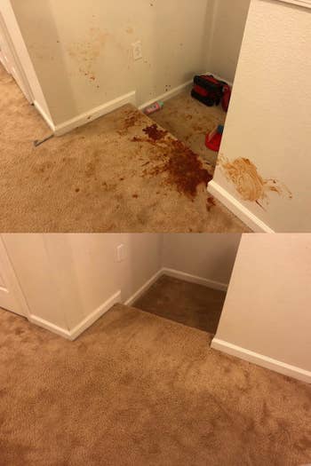 We hope you love our recommendations! While every product is independently chosen by our editors, BuzzFeed and our publishing partners may collect a share of sales or other compensation from the links on this page. You can read more about how our affiliate partnerships work in our Editorial Standards & Ethics Guide. Get thorough cleaning results with minimal effort required. I wrote this headline because this is exactly how I feel every time I need to clean my home. I look around and see nooks and crannies filled with grime, toddler-created carpet stains, and hard water and mold buildup in the bathrooms, and my brain says: DEEP CLEAN MODE ACTIVATE!! But my soul, which wants to spend more of my limited free time doing things like taking walks, reading books, and watching TV, counters with: ONLY THE LAZIEST OPTIONS PLEASE!! If you're the same, consider these products the happy medium between the two. Deep cleaning results, with lazy cleaning effort. Promising review: "These towels are awesome for so many things. They are large and very sturdy, so they work well for household cleaning. The real benefit for me, though, is having a wipe that works for things like the grill, the oven, the dashboard of my car, muddy shoes, chairs and umbrellas that go to soccer games and practices, and lawn furniture. I frequently wipe something down, rinse the towel, and wipe again. The wipes are heavy enough to go through three to four rinses and wipes and still hold up. The smell is mild and doesn't linger on my hands or what I've wiped down. Because the canister is heavier than most, and the lid fits well, it's easy to throw one of these in the trunk or cargo area without worrying about leaks. The canister's recyclable when the towels are gone — an added bonus." —COMom Some of the latest and greatest vacs have this built-in — but why not save $ and upgrade the vac you already have with a stick-on version? Promising review: "Best little light for your vacuum you can get. Charge lasts a long time. The adhesive is sooo strong it’s almost impossible to pull apart to charge. That’s actually a good thing. Because then it doesn’t fall off when you hit things with your vacuum. This shows everything you can’t see. So much so, you can’t stop vacuuming because you realize how dirty it all is." —Technical solutions This vac moves between hard floors and low-pile carpets/rugs without a glitch and can pick up all the accumulated dust, dirt, and hair left strewn about your home while you go do literally anything else. The reviewer who took the pic on the right above says that with a goldendoodle in the house, it picks up that much dust and hair EVERY DAY. Omg. Promising review: "Best housekeeping hack! I have to empty it almost everyday because it does it's job so well! I call her Mrs. Doubtfire and may purchase a twin to work upstairs as well. Timer was easy to set after reading the directions. Cleaning her out is a regular occurrence. She rarely gets stuck but usually only if the floor is cluttered worth cords or something. She also stops when she's full and needs to be cleaned instead of burning out her own motor which I think is nice. I have two Great Pyrenees and she handles the hair beautifully as well as the mess I track in from the barn." —Amazon Customer If you're sold on the idea but want to consider your options, here's how to choose the best robo vacuum model. My mom's had stainless appliances for well over a decade and a half now, and discovered this spray from reading our posts, and said it works *wonderfully*, truly 100% better than any other kind of stainless cleaners she'd tried in the past!! So naturally I bought a bottle when we moved to a place with stainless appliances, and I second every word she says. It's fast, cleans off all kinds of stains, and leaves a like-new shiny finish with a simple spray and wipe! If I'm in a hurry, I'll also use it on our granite counters and wood cabinets, and it works well there, too. Promising review: "10/10 would buy again. Works better than any stainless steel cleaner I’ve bought, or any DIY “hack” I’ve attempted. It also smells amazing and leaves my kitchen smelling fresh for a while after I use it. Plus the microfiber cloth is an added bonus and so far is up really well to repeated washes." —Sean Get a bottle and a streak-free cloth from Amazon for $19.95. You do have to let it sit for 4–5 hours (or even overnight), but the results, as proven by the review photos like the one here, are worth it. And spoiler alert: I'll show you later in this post that this cleans the mold in front-loading washing machine gaskets, too! Promising review: "It works! It took two applications to remove some of the mold stains from the silicone sealant/caulk around the bathtub. (Much of it was here long before we moved in.) But the difference was night and day both times. Do put masking tape or something to physically block people from getting in the shower!" —ESL Teacher In my experience it might take a couple of rounds for your carpet to look brand spankin' new, but it's worth it because this particular spray doesn't bleach out the fibers, doesn't need to be vacuumed up or rinsed, and doesn't attract new dirt to the area after you're done. It works well on all kinds of stains, like grease and oil, pet stains, wine, coffee, rust, food, makeup, and dirt. And, of course, it doubles as a laundry stain remover. I took the pictures on the right, when I melted a chocolate chip into my favorite couch pillow. As you can see, this spray got every bit of it out! So much so that I took pictures of both sides of the pillow because I couldn't find where the original stain had been! You can read more about that experience in my Folex stain remover review. Since having a baby, I've used this stuff on my carpet nearly at least once a week. First it was spit-up, now it's food stains from when he decides to throw pasta sauce or blackberries. (We're working on it.) It wor