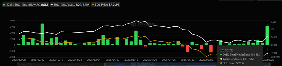 Solana price continues to trade within a defined consolidation range despite renewed optimism in broader markets. SOL has repeatedly tested resistance but failed to secure a decisive breakout. Institutional sentiment appears to be improving. However, on-chain activity tells a different story. While traditional market participants position for upside, active network investors are reducing exposure. Solana exchange-traded funds recorded $30.86 million in inflows on February 25. This marked the highest single-day inflow in more than two and a half months. The surge reflects growing institutional interest in SOL exposure through regulated investment vehicles. Strong ETF inflows often signal improving macro confidence. Investors appear optimistic about Solana’s long-term potential. However, one-day spikes do not confirm sustained demand. Without consistent capital inflows, ETF activity alone may not drive an immediate breakout in Solana price. Want more token insights like this? Sign up for Editor Harsh Notariya’s Daily Crypto Newsletter here. Technical indicators show that momentum is building beneath the surface. The Squeeze Momentum Indicator is currently forming an active squeeze. This setup often precedes periods of elevated volatility in crypto markets. Black dots on the indicator signal a potential bullish squeeze. When the compression releases, price volatility typically expands sharply. If the breakout aligns with strong demand, it could amplify SOL's upside momentum. However, volatility expansions can also move in either direction. Despite macro support, on-chain behavior suggests caution. Over the past three weeks, approximately 3.9 million SOL, valued at more than $298 million, have moved to exchanges. Transfers to exchanges often indicate intent to sell. Persistent exchange inflows suggest holders remain skeptical. Some investors may be offsetting prior losses. Others could be reacting defensively to broader crypto uncertainty. Continued selling pressure reduces the probability of an immediate Solana price breakout. Solana is currently consolidating between $88 resistance and $77 support. Multiple breakout attempts have failed within this range. Price action reflects equilibrium between buyers and sellers. Without a clear catalyst, this structure may persist. Given mixed macro and on-chain signals, continued consolidation appears likely. SOL may remain rangebound between $88 and $77 in the near term. ETF inflows provide support, but sustained exchange selling offsets bullish momentum. A decisive move above $88 would invalidate the bearish-neutral outlook. Breaking this resistance could open the path toward $97. Crossing $97 would increase SOL's probability of a move toward $100, provided network investors reduce selling activity and broader crypto sentiment remains stable. Read original story Solana ETF Inflows Hit 2.5 Month High — Why Is Price Still Subdued? by Aaryamann Shrivastava at beincrypto.com