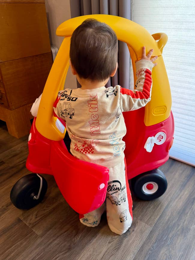 "I didn't stand a chance with the Young Days x Little Tikes drop — the second I saw the Wonder Wheels Crewneck and Bolinas Pants, I was immediately like, 'add to cart.' My son is obsessed with cars (especially his Cozy Coupe), so anything that feeds that little racer fantasy while also leaning into my own nostalgia? Sold. The set is ridiculously soft but still thick and stretchy in that durable way that can handle laps around the house and the general mayhem of an almost 2-year-old. It feels comfy enough for lounging but sturdy enough for full-speed toddler life. And a very fun bonus: the shipping box doubles as a "treasure chest" and comes with little puzzle pieces inside, which was such a sweet surprise. We love a green-conscious moment." —Crystal Ro