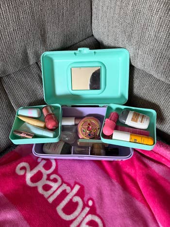 "I have a slight obsession with trying new lip balms and lip oils, and my collection was basically scattered all over my apartment. In an effort to round them up, I thought a mini Caboodle would be the perfect place to store them — and I was right! I used to steal my sister's original full-size case back in the day, so reaching for this always puts a smile on my face. Unlike a cosmetic pouch, this allows you to see everything easily, so there's no worry of anything getting lost and forgotten at the bottom of the pile. Plus, it's surprisingly spacious! The bottom portion is perfect for longer tubes, while the two top drawers are great for chunkier lip oils and glosses. It makes my '90s baby heart happy and organized." —Daniel Boan