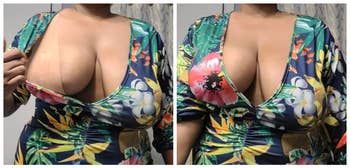 Promising review: "This stuff is amazing. I bought this gorgeous backless wedding dress with a plunging neckline and didn't think about how to make sure my boobs were covered and secure. The fabric was also pretty sheer. I took the dress to a seamstress who sewed pads in and did an awful job. The pads looked lumpy, they were too far down, and one was an inch lower than the other. In a panic with only a week before the wedding, I took to Amazon and landed on this tape. Y'all... This stuff is awesome. I applied it with no practice literally five minutes before my ceremony. Even with no idea of how to apply or what I was doing, I managed to secure my boobs AND they looked amazing. I'm a D cup and didn't expect much lift, but there was lift, coverage, and just enough cleavage. It stayed on during 90-degree weather and was easily removed after a quick soak in the bathtub and a little coconut oil. I will definitely use this stuff again. I feel like this tape has opened up new wardrobe possibilities for me. If you're on the fence, just get it. Saved my wedding." —MelBee