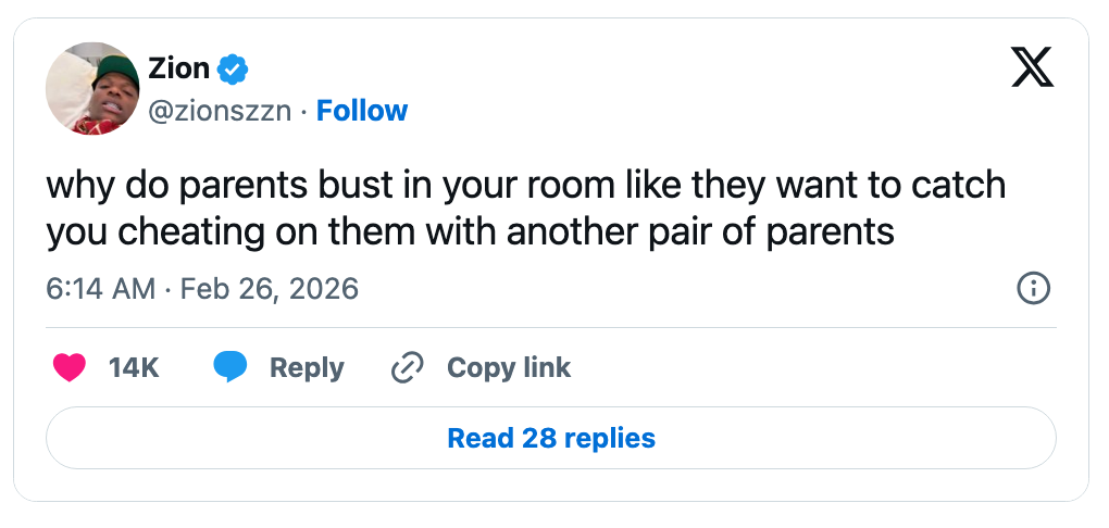 "why do parents bust in your room like they want to catch you cheating on them with another pair of parents?"
