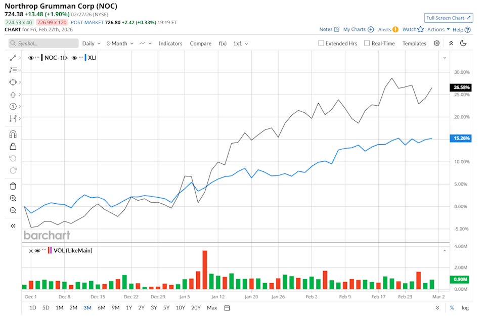 Falls Church, Virginia-based Northrop Grumman Corporation (NOC) is an aerospace and defense technology company with a market cap of $102.8 billion. It provides products such as stealth aircraft, autonomous systems, missile defense solutions, radar and cybersecurity technologies, and space satellites and launch systems. Companies valued at $10 billion or more are typically classified as “large-cap stocks,” and NOC fits the label perfectly, with its market cap exceeding this threshold, underscoring its size, influence, and dominance within the aerospace & defense industry. The company is heavily investing in Digital Engineering, which has allowed it to design and test new systems in virtual environments before physical prototyping. Citi Analysts Like This 1 ‘Picks-and-Shovels’ AI Stock. Should You Buy It Here? Nvidia Stock May Be Oversold - What is the Best NVDA Play? Analysts Think Okta Stock Can Gain 100% in 2026. Should You Buy the Dip? Tired of missing midday reversals? The FREE Barchart Brief newsletter keeps you in the know. Sign up now! This aerospace and defense giant is currently trading 2.8% below its 52-week high of $745.55, reached on Feb. 19. Shares of NOC have surged 27.7% over the past three months, outperforming the State Street Industrial Select Sector SPDR ETF’s (XLI) 15.9% uptick during the same time frame. Moreover, on a YTD basis, shares of NOC are up 27%, compared to XLI’s 14.2% rise. In the longer term, NOC has soared 57.5% over the past 52 weeks, outpacing XLI’s 31.7% gain over the same time frame. To confirm its bullish trend, NOC has been trading above its 200-day moving average since mid-June, with slight fluctuations, and has remained above its 50-day moving average since mid-December. On Jan. 27, shares of NOC rose 2.7% after the company reported better-than-expected fourth-quarter results. Driven by solid revenue growth across all reporting segments, its net sales climbed 9.6% year over year to $11.7 billion, slightly exceeding consensus estimates. Additionally, supported by strong operating income growth in its aeronautics, mission, and space systems divisions, adjusted EPS came in at $7.23, up 13.1% compared to the prior-year quarter and 3.3% above analyst forecasts. NOC has outperformed its rival, Lockheed Martin Corporation (LMT), which surged 47.4% over the past 52 weeks. However, it has lagged behind LMT’s 36.1% rise on a YTD basis. Looking at NOC’s recent outperformance, analysts remain moderately optimistic about its prospects. The stock has a consensus rating of "Moderate Buy” from the 22 analysts covering it, and the mean price target of $741.80 suggests a 2.4% premium to its current price levels. On the date of publication, Neharika Jain did not have (either directly or indirectly) positions in any of the securities mentioned in this article. All information and data in this article is solely for informational purposes. This article was originally published on Barchart.com