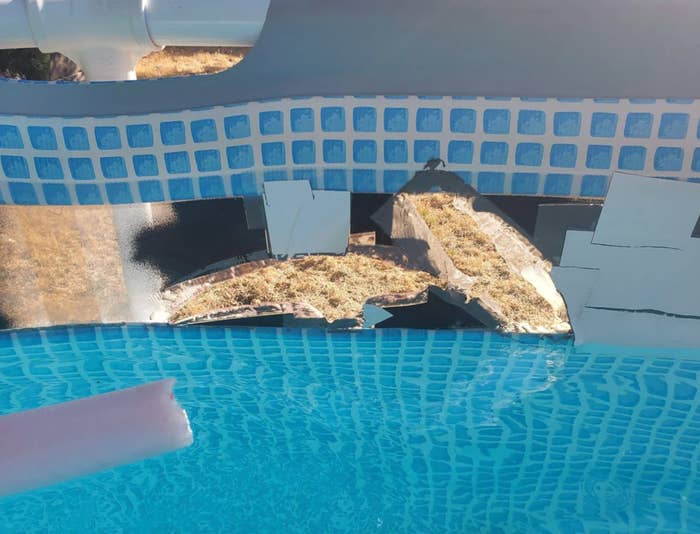 It is a picture of the rip in the side wall of an above-ground pool.