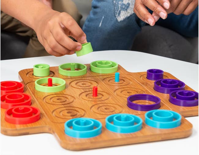 To win, players must get three circular pieces of their color in a row in either ascending or descending order, get the same-sized pieces in a row, or get three concentric pieces in the same space. But beware of other players attempting to block you!