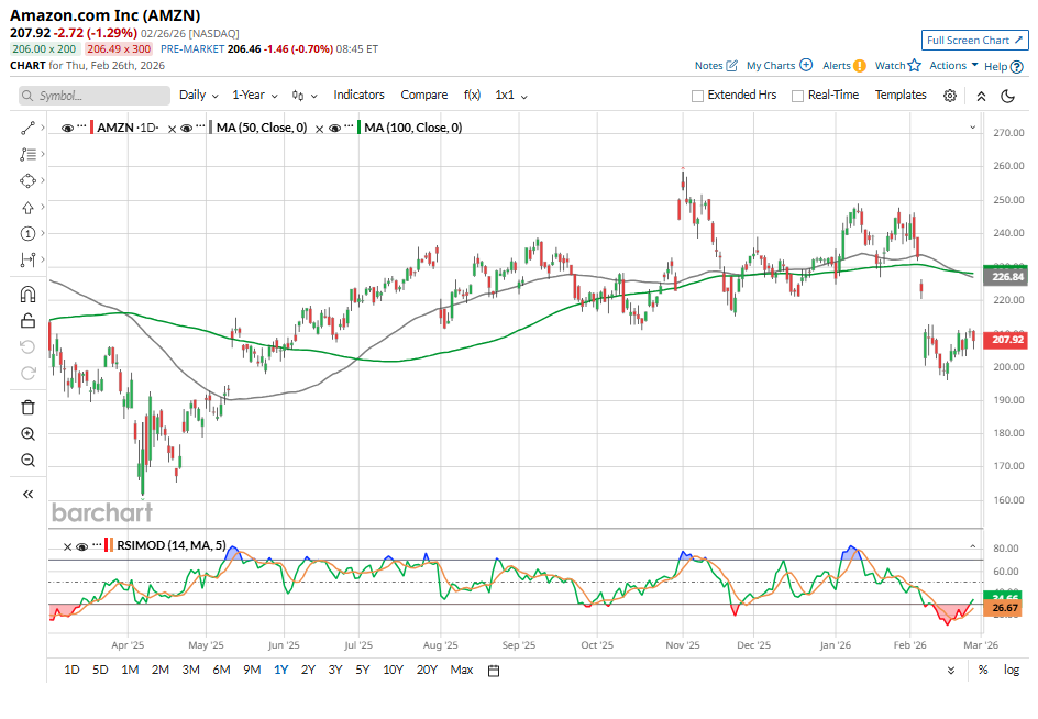 Amazon (AMZN) stock has lagged its Big Tech peers over the past year, rising approximately 6% over the last 12 months but down about 7% year-to-date (YTD), making it one of the weakest performers within the “Magnificent Seven” group. This underperformance reflects mounting competitive pressures in its most profitable segment and rising concerns about future margins. The primary source of investor caution is Amazon Web Services (AWS), the company’s high-margin cloud computing division. AWS faces intensifying competition from Google Cloud, owned by Alphabet (GOOGL), and Microsoft (MSFT) Azure. Both rivals continue to expand aggressively, investing heavily in infrastructure and artificial intelligence (AI) capabilities to gain market share. As enterprise customers diversify cloud providers and demand advanced AI functionality, AWS is operating in an increasingly competitive environment. Dear Costco Stock Fans, Mark Your Calendars for March 5 SanDisk Stock Forecast: Can the Rally Continue Into 2026? Dear Broadcom Stock Fans, Mark Your Calendars for March 4 Get exclusive insights with the FREE Barchart Brief newsletter. Subscribe now for quick, incisive midday market analysis you won't find anywhere else. Adding to these concerns, Amazon plans to substantially increase its capital expenditures in 2026. During the fourth-quarter conference call, Amazon announced $200 billion in capital spending, with the majority allocated to AWS. Amazon has outlined a significant increase in capital expenditures, attributing the move primarily to exceptionally strong demand within AWS. The scale of the planned investment reflects the company’s strategic focus on expanding data-center capacity and enhancing its AI infrastructure. Management views this buildout as essential to meeting accelerating customer demand and sustaining long-term growth in cloud computing and AI-driven services. AWS is experiencing robust demand, particularly in AI-related workloads. Management indicated that the newly installed capacity is being monetized rapidly. Amazon expects that incremental capacity will be fully utilized. The company believes this expansion will strengthen its competitive positioning in an attractive sector, while supporting strong returns on invested capital over time. However, the stepped-up capital spending is likely to exert pressure on margins. In addition, Amazon’s trailing 12-month free cash flow has consistently declined on a quarter-over-quarter basis, falling from $47.74 billion in the third quarter of 2024 to $11.19 billion in Q4 2025. With capital expenditures set to rise further, free cash flow could turn negative in 2026. In sum, Amazon’s rising capital expenditures reflect the company’s strategy to capitalize on strong demand for cloud and AI. While the investments may strengthen its long-term competitive position and revenue potential, they introduce short- to medium-term pressure on cash flow and profitability metrics. The increased competition and higher capex pose challenges for AMZN stock and add uncertainty. The Street’s lowest price target for AMZN stock is $175, implying about 19% potential downside from current levels. However, despite these pressures, Amazon’s fundamental outlook remains constructive, supported by accelerating performance in its cloud and advertising segments, a fast-growing chips business, and improving operating metrics within its online retail business. The company’s cloud platform, AWS, delivered 24% year-over-year (YOY) revenue growth in the fourth quarter, marking its fastest expansion in thirteen quarters. Quarterly AWS revenue increased by $2.6 billion sequentially and almost $7 billion compared with the prior-year period, bringing AWS to a $142 billion annualized revenue run rate. In addition to core cloud services, Amazon’s custom silicon portfolio, including its Graviton and Trainium processors, has scaled meaningfully. This chips business has surpassed a $10 billion annual revenue run rate and is expanding at triple-digit YOY rates. Continued investment in infrastructure capacity and incremental service offerings is expected to further support growth across the AWS ecosystem. Notably, Amazon is also experiencing strong demand for non-AI workloads, driven by ongoing cloud migration initiatives. Advertising represents another significant growth driver. Q4 advertising revenue increased 22% YOY to $21.3 billion, benefiting from Amazon’s full-funnel strategy that connects brands with consumers across its commerce and media properties. With strong momentum in AWS and the advertising business, and emerging opportunities in AI, custom chips, low Earth orbit satellite initiatives, and robotics, Amazon’s long-term growth potential remains solid. Wall Street sentiment remains favorable. AMZN stock carries a consensus “Strong Buy” rating, with an average price target of $284.75, suggesting approximately 32% potential upside from current levels. Meanwhile, the highest price target of $360 implies potential appreciation of roughly 67% over the next 12 months. On the date of publication, Sneha Nahata did not have (either directly or indirectly) positions in any of the securities mentioned in this article. All information and data in this article is solely for informational purposes. This article was originally published on Barchart.com