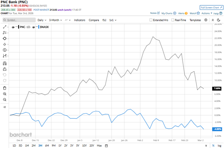 The PNC Financial Services Group, Inc. (PNC), headquartered in Pittsburgh, Pennsylvania, is a leading diversified financial institution operating across the U.S. It provides banking, lending, wealth management, and asset management services to individuals, businesses, and institutions, serving millions of customers. The company has a market capitalization of $86.41 billion, making it a “large-cap” stock. Its shares reached an all-time high of $243.94 on Feb. 6, but are down 12.7% from that level. Stabilizing interest rates, solid quarterly earnings, alongside strong loan growth and deposit increases, have boosted investor confidence. Over the past three months, PNC’s stock has gained 7.6%, while the broader Nasdaq Composite ($NASX) index is down 4% over the same period. Dear Costco Stock Fans, Mark Your Calendars for March 5 SanDisk Stock Forecast: Can the Rally Continue Into 2026? Dear Broadcom Stock Fans, Mark Your Calendars for March 4 Markets move fast. Keep up by reading our FREE midday Barchart Brief newsletter for exclusive charts, analysis, and headlines. Over the past 52 weeks, PNC’s stock has gained 12.4%, while the Nasdaq Composite index is up 22.7%. However, this year, the stock has increased 2.1%, while the broader index has dropped by 3.1%. The stock has traded above its 200-day moving average since late November and is currently below its 50-day moving average since late February. On Jan. 16, PNC reported its fourth-quarter earnings for fiscal 2025. On the same day, the stock surged 3.8% intraday. The company’s overall revenue increased 9.1% year-over-year (YOY) to a record $6.07 billion. Its net interest income for the quarter was $3.73 billion, up 5.9% from the prior-year period, driven by lower funding costs, loan growth, and the continued benefit of fixed-rate asset repricing. In January, PNC also closed its acquisition of FirstBank Holding Company (including the FirstBank banking subsidiary), which significantly expands the company’s presence across high-growth communities in Colorado and Arizona. Wall Street analysts expect its EPS to increase 16.8% YOY to $4.10 (on a diluted basis) for the current quarter. We compare PNC’s performance with that of another regional bank stock, Truist Financial Corporation (TFC), which has gained 8.5% over the past 52 weeks, but only marginally year-to-date. Therefore, PNC has been the clear outperformer over these periods. Wall Street analysts are moderately bullish on PNC’s stock. The stock has a consensus rating of “Moderate Buy” from the 24 analysts covering it. The mean price target of $250.48 implies a 17.6% upside from current levels. The Street-high price target of $284 indicates a 33.3% upside. On the date of publication, Anushka Dutta did not have (either directly or indirectly) positions in any of the securities mentioned in this article. All information and data in this article is solely for informational purposes. This article was originally published on Barchart.com
