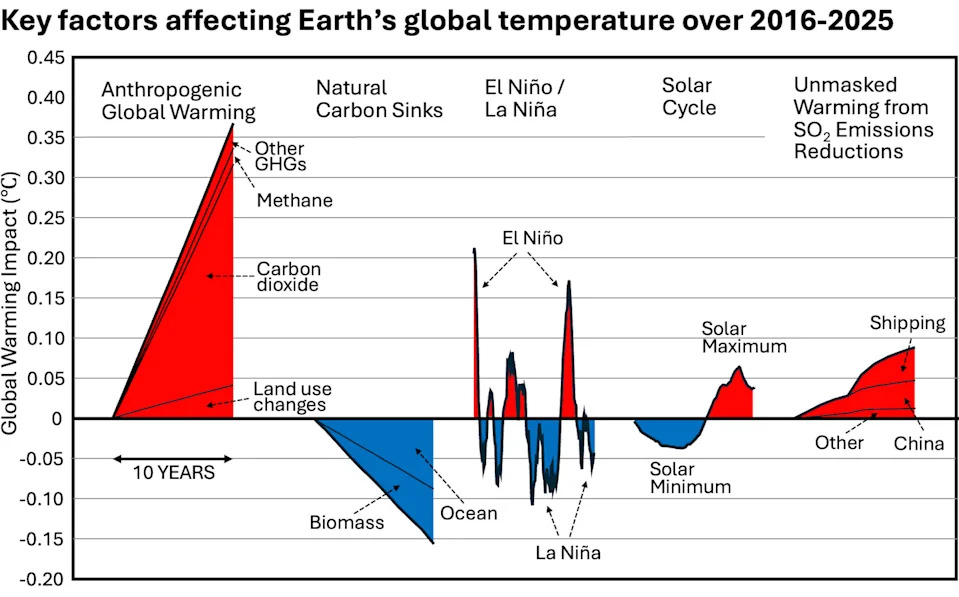 The past three years have been the world’s hottest on record by far, with 2025 almost tied with 2023 for second place. With that energy came extreme weather, from flash flooding to powerful hurricanes and severe droughts. Yet, by most indicators, the planet should have been cooler in 2025 than it was. So, what happened, and what does that say about the year ahead? As an earth and environmental scientist, I study influences that affect global temperatures year to year, such as El Niño, wildfires and solar cycles. Some make Earth hotter. Some make it cooler. And one particularly unhealthy influence has been quietly hiding a large amount of global warming – until now. The Earth’s climate is the result of many factors that change from year to year. Some that helped make 2025 cooler than 2024 include: La Niña’s arrival: La Niña is part of the El Niño-Southern Oscillation, a natural climate pattern that fluctuates between warm El Niño conditions and cooler La Niña conditions. During El Niño, the Pacific Ocean heats up along the equator, influencing the atmosphere in ways that can cause intense storms, droughts and heat waves around the planet. La Niña does the opposite; it’s like putting an ice pack on the atmosphere. Both 2023 and 2024 were El Niño years, but in 2025 conditions shifted to neutral and then to La Niña starting in September. The solar cycle: The Sun reached its solar maximum near the end of 2024, the peak of its energy output in an approximately 11-year cycle, and began declining in 2025. So, while the sun’s output was still stronger than average in 2025, it was less than in 2024. Fewer wildfires: Despite some destructive blazes, the world also saw fewer wildfires during 2025 than 2024, which put less carbon dioxide – a planet-warming greenhouse gas – into the atmosphere. Despite those points, 2025 still ended up as the third-hottest year in over 175 years of record-keeping and likely one of the warmest in at least several thousand years. It was nearly as warm as 2023, at 2.6 degrees Fahrenheit (1.47 Celsius) above the 1850-1900 average, according to the European Union’s Copernicus Climate Change Service. It also had the second-highest average land temperature recorded, up 3.6 F (2 C) compared to preindustrial years, with more than 10% of the land experiencing record-high temperatures. Several other factors made 2025 warmer than expected, and some are likely to continue to increase in 2026. They include: Greenhouse gas emissions: The big driver of global warming is excess greenhouse gas emissions, largely from burning fossil fuels, and 2025 had plenty. Greenhouse gases trap heat near Earth’s surface like a blanket, raising the temperature. They also linger in the atmosphere for years to centuries, meaning gases released today will continue to warm the planet well into the future. The levels of carbon dioxide, methane and nitrous oxide in the atmosphere all increased in 2025. Rising energy demand drove an increase in fossil fuel use. About 80% of the increasing electric power demand came from emerging economies, largely for rising air conditioning demands as the world gets hotter. In the U.S., the rapid growth of data centers for AI and cryptocurrency mining helped boost U.S. carbon dioxide emissions by 2.4%. Earth’s energy imbalance: Other sources can disrupt the natural balance between the amount of sunlight that reaches Earth and the lesser amount radiated back to space. A recent study found that Earth’s energy uptake surged and temperatures rose quickly when a rare three-year La Niña in 2020-2022 shifted to El Niño in 2023-2024. Declining polar ice, which efficiently reflects sunlight back into space, also affects the energy balance. As sea ice declines, it leaves dark ocean water that absorbs most of the sunlight that reaches it. In a spiraling feedback, warmer water melts sea ice, allowing more sunlight into the ocean, warming it faster; 2025 had the lowest winter peak of Arctic sea ice on record and the third-lowest minimum extent of Antarctic ice. Air pollution: Sulfate aerosol pollution from coal combustion and burning heavy fuel oil in shipping has also been affecting Earth’s energy balance. It has been masking the full effects of human-caused greenhouse gases for years by reflecting sunlight back into space, creating a cooling effect. But sulfate aerosol pollution is also a serious health hazard, blamed for about 8 million human deaths per year from lung diseases. Recent reductions in sulfate pollution – now 40% less than 20 years ago – have meant about a 0.2 F (0.13 C) increase in global temperatures. Much of the reduction was from China’s efforts to reduce its notoriously bad air pollution in recent years and international shipping rules in effect since 2020 that have reduced sulfur emissions from large ships by 85%. Taking all factors together, humans are now warming the planet at a faster rate than at any point in human history: at about 0.5 F (0.27 C) per decade. That extra heat can fuel extreme weather, including flash floods, heat waves, extended droughts, wildfires and coastal flooding, affecting human lives and economies. Most climate models predict 2026 will be about as hot as 2025, depending on whether a Pacific El Niño develops, which forecasters give about a 60% chance of happening. The planet is already starting the year out warm, even if it doesn’t feel like that everywhere. While January was very cold in parts of the U.S., globally, Earth saw its fifth-warmest January on record, and much of the western U.S. saw one of its warmest winters on record. Solar output will continue to decrease slowly in 2026. However, the International Monetary Fund projects strong global economic growth at about 3.3%, suggesting electricity demand will also continue to grow. The International Energy Agency expects global electricity demand to increase by 3.6% per year through at least 2030. Even though global renewable energy use