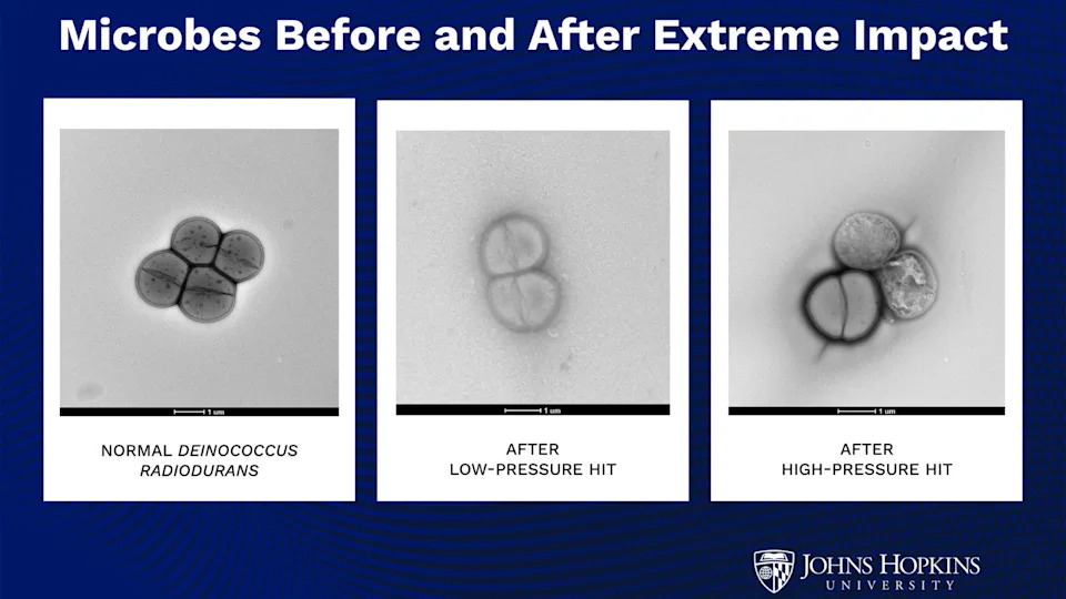 When you buy through links on our articles, Future and its syndication partners may earn a commission. A remarkably hardy bacterium can survive pressures similar to those generated when asteroid impacts blast debris off Mars, a new study has found, suggesting that microbes could endure interplanetary journeys and potentially seed life on other worlds, including Earth. The findings, published earlier this week in the journal PNAS Nexus, may prompt scientists to reconsider where life could exist across the solar system and could lead to a reassessment of "planetary protection" rules designed to prevent contamination between worlds. "Life might actually survive being ejected from one planet and moving to another," study co-author Kaliat Ramesh, a mechanical engineer at Johns Hopkins University in Maryland, said in a statement. "This is a really big deal that changes the way you think about the question of how life begins and how life began on Earth." The new findings lend support to a long-debated theory known as lithopanspermia, which proposes that life can spread between planets by hitching a ride on fragments of rock blasted into space by massive impacts. The idea remains unproven, however, and clear evidence of past or present life on Mars remains elusive (though scientists have made some intriguing finds lately). For the study, Ramesh and his colleagues tested the endurance of Deinococcus radiodurans, an exceptionally resilient bacterium found, among other places, in Chile's high-altitude deserts. With a thick outer shell and a remarkable ability to repair its own DNA, D. radiodurans is famously tolerant of intense radiation, freezing temperatures, extreme dryness and other harsh conditions similar to those found in space. It has been nicknamed "Conan the bacterium," after all. To simulate the forces involved in an asteroid impact, the researchers sandwiched samples of D. radiodurans between two steel plates. Using a gas-powered gun, they fired a projectile at roughly 300 mph (480 kph), subjecting the microbes to pressures between 1 and 3 gigapascals. For comparison, the pressure at the deepest part of Earth's oceans — the crescent-shaped Mariana Trench in the western Pacific Ocean near Guam — is about 0.1 gigapascal, meaning even the lowest pressure in the experiment was roughly 10 times greater. Nearly all of the microbes survived impacts generating 1.4 gigapascals of pressure, while about 60% remained alive at 2.4 gigapascals. At lower pressures, the cells showed no signs of damage, though researchers observed ruptured membranes and some internal cellular damage at higher pressures, the study reports. "We continuously redefine the limits of life," Madhan Tirumalai, a microbiologist at the University of Houston who was not involved with the new study, told The New York Times. "This paper is another example." As the pressure increased, the researchers also detected heightened activity in genes responsible for repairing DNA and maintaining cell membranes. "We expected it to be dead at that first pressure," Lily Zhao, a mechanical engineer at JHU who led the experiment, said in the statement. "We started shooting it faster and faster. We kept trying to kill it, but it was really hard to kill." The experiment eventually ended, the statement read, because the steel structure holding the plates "fell apart before the bacteria did."