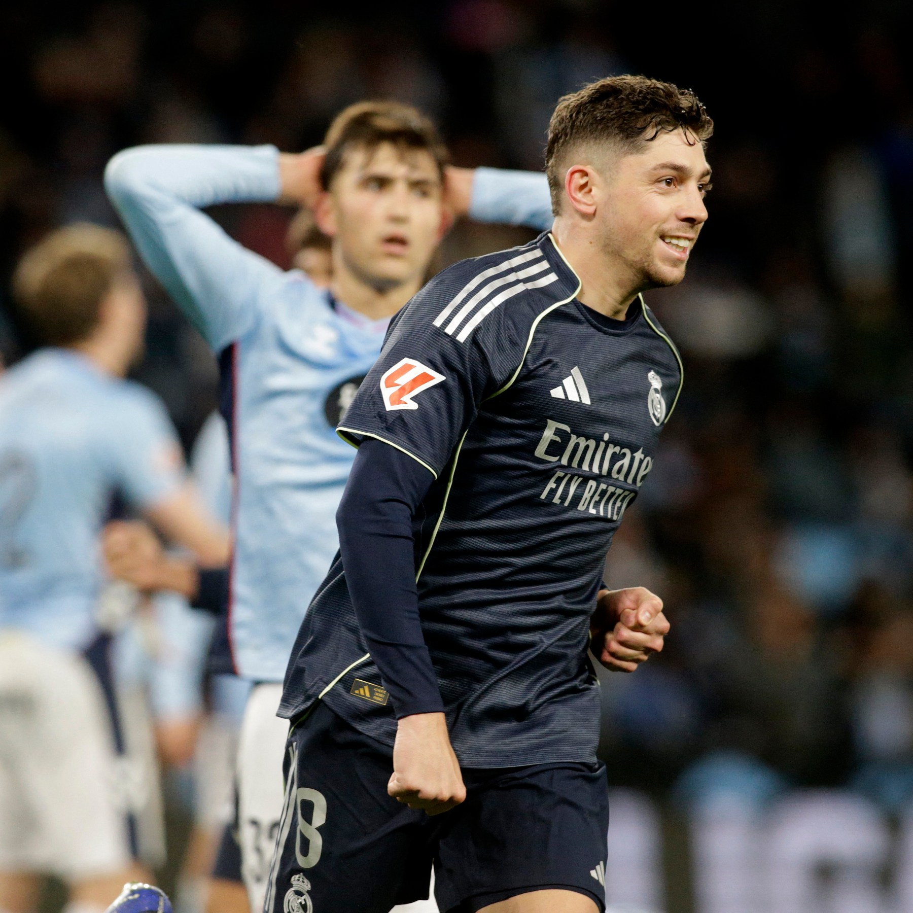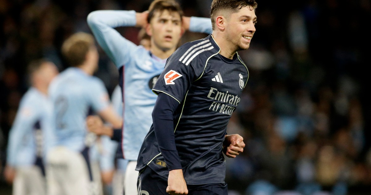 Federico Valverde scores in injury-time as Real Madrid win 2-1 at Celta Vigo to maintain their La Liga title chase. Share Save Federico Valverde’s deflected effort four minutes into added time earned Real Madrid a hard-fought 2-1 victory at Celta Vigo in La Liga, ending a run of two successive defeats and keeping them firmly in the title race. Aurelien Tchouameni’s strike put the visitors ahead in the 11th minute on Friday, but Borja Iglesias levelled in the 25th after Williot Swedberg broke down the left and crossed low. Trent Alexander-Arnold was heavily at fault for the goal, allowing the Celta forward to win back the ball before cutting inside and assisting with a perfect layoff. Real, missing nine players through injury and suspension, controlled much of the second half without creating clear chances. Vinicius Junior had his side’s first effort on target since the first period when he drilled low at the keeper from just outside the box in the 57th minute. Substitute Iago Aspas hit the post in the 88th minute as Celta countered before Valverde tried his luck from distance and saw his strike deflect off the defender and past the wrong-footed keeper. There was yet more drama as the Real celebrations turned to nerves; the teams awaited news of whether the referee would be asked to review a potential foul in the build-up to the goal. No such intervention came, and the relief from Real, and the distraught from Celta, as the full-time whistle blew seconds after the restart was palpable. “It hurts because it was right at the death,” Celta striker Iglesias said. “It’s a bit frustrating.” Barcelona lead with 64 points, one ahead of Real, and face Athletic Bilbao on Saturday. Celta remains sixth with 40.