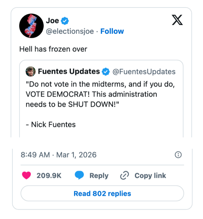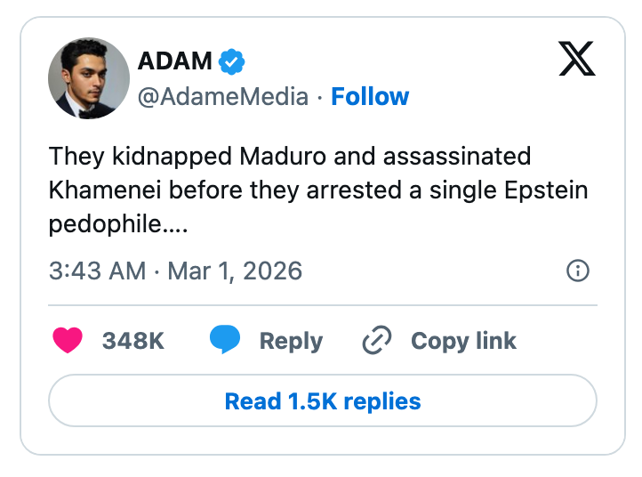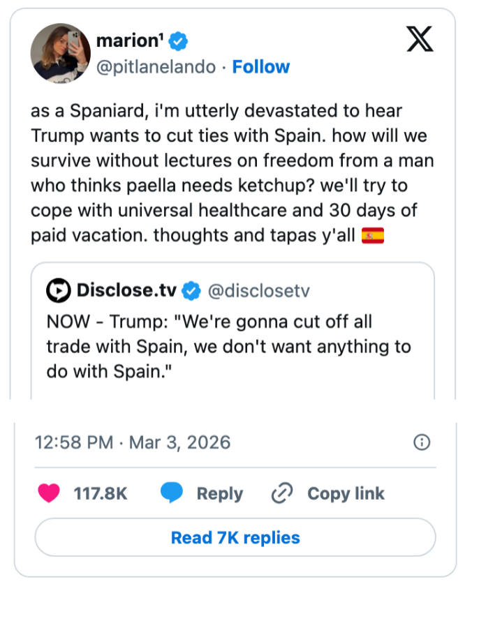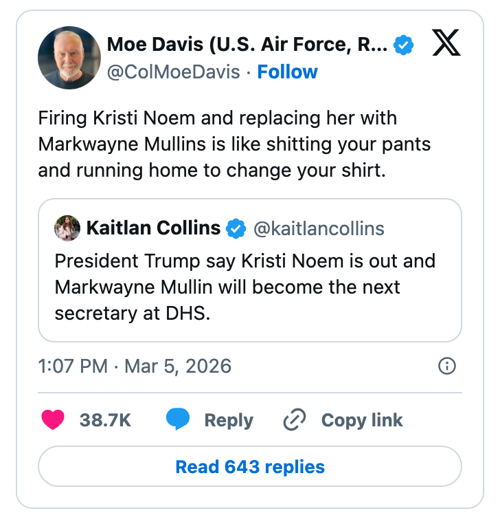 "Kash Patel is busy today praying he doesn’t get Noem’d since he needs the FBI jet to get to Coachella next month." I'm the AAPI Culture Editor here at BuzzFeed, where I cover everything from trending news to pop culture to AAPI issues. Editor's Note: While we can't endorse what X has become, we can bring you the worthwhile moments that still exist there, curated and free of the surrounding chaos. He looks alive to me. https://t.co/T0FzKy2Z3a You occasionally get a moment that symbolizes everything wrong with this country. In this case it's a U.S. Marine veteran screaming out that no one wants to fight for Israel and a U.S. Senator breaking his arm. A perfect encapsulation of US foreign policy. pic.twitter.com/FqgSvodurk This is frying me https://t.co/i0DWNMdnwe Can you imagine the Republican reaction if a woman president said she went to war because she had a “feeling” https://t.co/eJq82K1FB8 Rubio: “Iran is run by religious fanatics.”The White House right now: pic.twitter.com/zWxY3wvwAK US: “It was a preemptive attack on Iran”Pentagon: “No sign that Iran was going to attack first”US: “No but if Israel attacked Iran, then Iran would have attacked us, so we preemptively attacked them first” 🤡This is beyond satire. pic.twitter.com/Y6wRzO2CHx Holy shit, Senator Tillis just flash fried Kristi Noem over her failed leadership and FINALLY screamed at her for killing that puppy.This was BRUTAL. 🔥🔥🔥 pic.twitter.com/UtILasodt0 Lawrence O’Donnell: “The only president in history, who in the third day of a war, is talking to the world about the drapes that he chose.”Motherfucker is giving a drapery update 3 days into a war. Imagine FDR updating America on his fabric swatches during D-Day. pic.twitter.com/b1yuK7xnWW Mullin: Trump ended eight warsHunt: He started this oneMullin: This isn’t a warHunt: The Secretary of Defense, who calls himself the Secretary of War, said today, this is a war pic.twitter.com/TL5SKszXNM Note: The image in the original tweet was replaced here due to photo rights. Really seems like this is just occurring to him for the first time https://t.co/y3lkRcVBh6 I knew my teenage son was going to get into the liquor cabinet after I fell asleep and then go street racing. To prevent that, I drank all the booze myself, got into the car, and crashed it into the nearest oak tree.It was the responsible thing to do. pic.twitter.com/cgNKjd8ttB Note: The images in the original tweet were replaced here due to photo rights. Moskowitz: "Let me congratulate the former Homeland Security Secretary on her appointment to be the Shield of Americas, which I'm pretty sure the president came up with when he watched the last Avengers movie" pic.twitter.com/zapJmvuHpS Talarico: They're going to throw everything they have at us. They're going to call me a radical leftist. They're going to call me a fake Christian. They'll call our movement un-American. They'll call us a threat. The only truth is we are a threat to their corrupt system. pic.twitter.com/RZo22kR78q For more political tweets, check out our most recent roundup: "Please Restrain From Drinking Too Much As You Have Been Warned From Your Staff": 59 Political Tweets From The Last Month That Are So Brutal But So Real