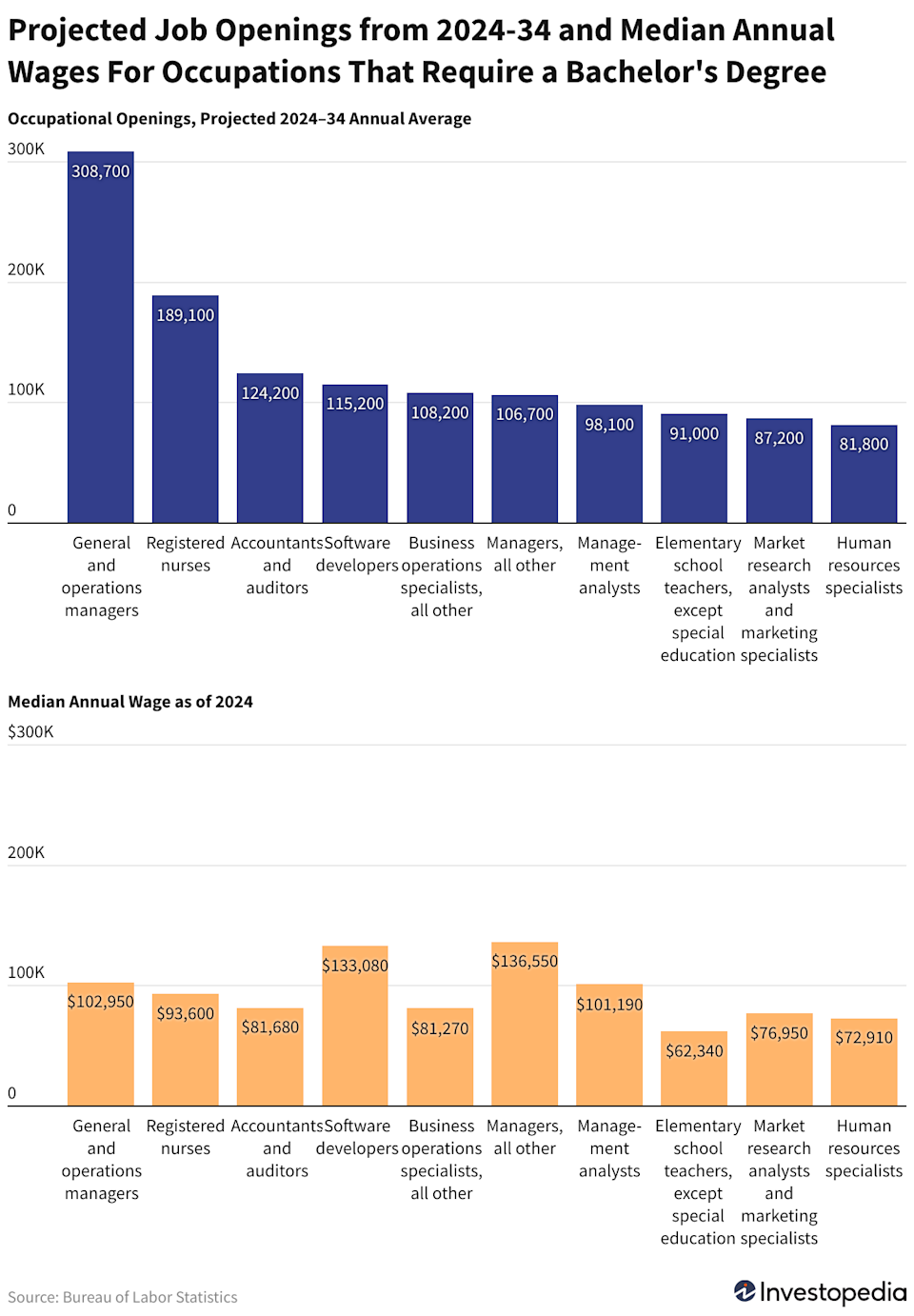 The Bureau of Labor Statistics projects millions of job openings through 2034 for workers with degrees in fields like business administration, nursing, accounting, and computer science. Four of the top 10 pay more than $100,000. A business administration degree qualifies you for six of the 10 occupations with the most projected openings. This year, the Bureau of Labor Statistics identified the top 10 jobs with the most projected openings from 2024 to 2034 for workers with a bachelor's degree—and four of them pay six figures. For students weighing whether college is still worth it, this list offers a roadmap to the degrees most likely to lead to employment. Many Americans are wondering if a bachelor's degree is still worth it, as tuition costs soar and newly minted graduates struggle to find jobs in their field. While the data shows that a college degree is still largely a good investment, that can be cold comfort to graduates sending out hundreds of applications without a single callback. The good news is that certain degrees can lead to more favorable job prospects. A business administration degree, for example, can qualify you for six of the 10 occupations with the most projected openings through 2034, including accountants, management analysts, and human resources specialists. Not all college degrees pay off equally. With tuition costs climbing faster than inflation, choosing a major with strong job prospects can mean the difference between landing work quickly and struggling to find a foothold as you start your career. Topping the list are general and operations managers, who are expected to see about 308,700 job openings each year. That's more than any other job requiring a bachelor’s degree. These roles typically involve planning, directing, coordinating, and overseeing multiple departments within public or private sector organizations. Aspiring general or operations managers are generally advised to pursue a bachelor’s degree in business administration, management, or finance. Other degrees have a narrower path but strong demand. A bachelor of science in nursing leads to registered nurse roles, the second-highest category for openings. A computer science degree can land you a job as a software developer, one of the four six-figure careers on the list. The table below shows the degrees typically required for each of the top 10 jobs. These aren't the only credentials that can get you there, but they're the most common in each field. Degrees Commonly Required for the BLS's Top 10 Job Openings Occupation Degree Required General and operations managers Bachelor's in business administration, management, or finance Registered nurses Bachelor of Science in Nursing Accountants and auditors Bachelor's in accounting Software developers Bachelor's in computer science or software engineering Business operations specialists, all other Bachelor's in business administration or management Managers, all other Bachelor's in business administration or management Management analysts Bachelor's in business administration, finance, or public administration Elementary school teachers, except special education Bachelor's in elementary education or child development. A teaching license is also required Market research analysts and marketing specialists Bachelor's in marketing, psychology, or business administration Human resources specialists Bachelor's in human resources, business administration, or social science Read the original article on Investopedia