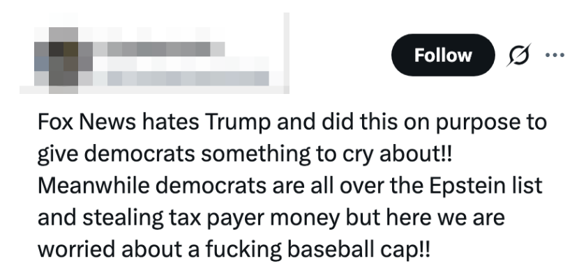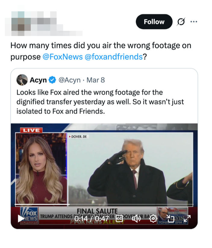 I'm the AAPI Culture Editor here at BuzzFeed, where I cover everything from trending news to pop culture to AAPI issues. Take your hat off, you disgusting little man. https://t.co/9CLllVr2nI Note: The image in the original tweet was replaced here due to photo rights. Wow -- as first spotted by @BadFoxGraphics, Fox & Friends this morning used *old footage of a previous dignified transfer* to mislead their audience about the fact that Trump wore a baseball cap during the one yesterday pic.twitter.com/5Xn3Q6ksx5 According to AP News, Fox released an additional statement: "We regret the error and apologize for the incorrect footage."