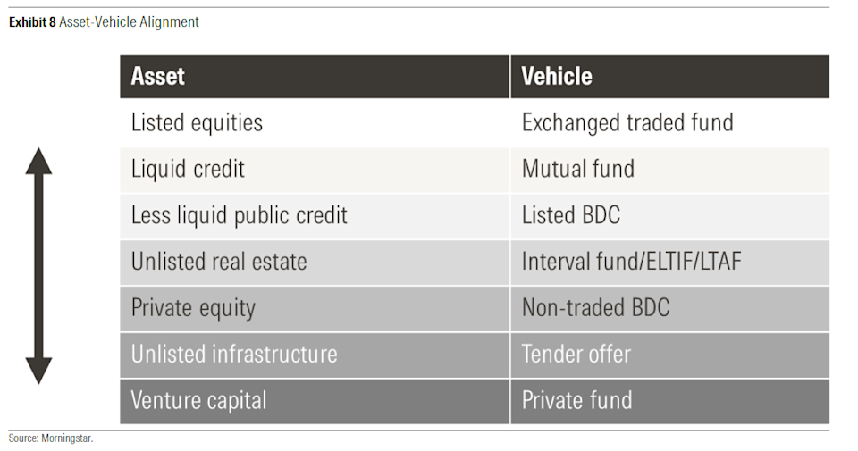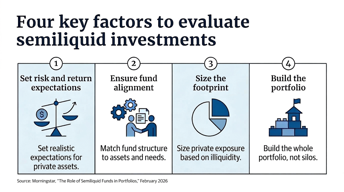 To effectively invest in private vehicles, financial advisors and clients must avoid buying into common myths about their returns and correlation with public funds, a Morningstar study said. So-called semiliquid investment assets such as private equity, private credit, venture capital, real estate and other alternative vehicles require horizons of at least seven to 10 years and careful scrutiny of any managers' claims that higher returns will justify their bigger expenses, the independent research firm said in the report. Released last month, the research came out a week before Blue Owl Capital announced it would cease filling investor redemption requests for one of its private credit funds ahead of the complete drawdown of the vehicle's assets. It was the latest cautionary signal about the "democratization" of private investments. Morningstar's study argued that, as investors and advisors consider asset managers' sales pitches, they should keep in mind that, for example, private equity funds bring diversification that is "hard to quantify and arguably overstated at face value." These funds offer opportunities to expand stock allocation beyond publicly traded ones, rather than providing "market-neutral" exposure, the study said. While the draw of potentially higher returns and diversification in a time with fewer publicly traded companies is understandable, authors Sam Hui, Francesco Paganelli and Chris Tate prescribed some rules for evaluating any semiliquid investments. "Contrary to common marketing claims, semiliquid strategies often carry traditional equity or credit risks and are not suitable to play the role of portfolio diversifiers," they wrote. "Most semiliquid funds should be seen as expanding the equity or credit opportunity set rather than adding new risk factors. To genuinely reap the benefits of semiliquid funds, investors need three things: patience and long-term mindset, a return premium to compensate for complexity and illiquidity and proficiency in selecting the right managers. We suggest four key steps to drive portfolio construction: setting expectations on risk and returns; ensuring alignment across fund structure, assets, and investors; sizing the footprint; and building the portfolio." READ MORE: Mindful of risks, RIAs steer clients into private markets Advisors on the receiving end of industry marketing have been educating clients about alternative investments with many of these principles in mind. Problems for investors often arise from the simple fact that many simply don't grasp "how the vehicles actually work," according to Kevin Thompson, the founder of Fort Worth, Texas-based 9I Capital Group. Many alternative managers are turning to retail clients because they're struggling to raise capital from institutional investors, and the structure of some of the products call for sending the returns to bigger shareholders before they reach other customers, he noted. "They're trying to raise capital," Thompson said of private equity funds. "At the end of the day, the average investor doesn't need something like this, in my humble opinion. The average investor is doing fine in something like index funds." In the current conditions, fiduciary planners' due diligence of alternative vehicles is guarding "all the chickens in the henhouse," said Peggy Haslach, head of the Tukwila, Washington-based office of Planning for Good. "A lot of advisors will try to solve clients' problems with what's new and hot and everybody's talking about, but, at the end of the day, is it really the right choice for that client?" she said. "Everyone is so fee-sensitive these days, so why would you put somebody in something like that?" The fact that giant companies such as OpenAI and SpaceX "are staying private longer" has led to "a semiliquid paradigm shift," said Devon Drew, founder and CEO of AssetLink, a data-driven distribution service connecting asset management firms with advisors and wealth management companies. With higher fees, though, advisors and investors "should only swim in the deep end" if the returns "justify the complexity and illiquidity," he said. "Fees are definitely high," Drew added. "The position must be sized carefully to really avoid eating an entire portfolio's alpha." Such warnings stem from the simple math equation at the heart of any investment portfolio between costs and profits. To deliver that "illiquidity premium" over public investments, private vehicles' returns must surpass them by at least 2%, according to an investor survey cited in Morningstar's report. And, besides long investment horizons, products such as interval funds charge expense ratios of about 2.7%, and tender offer vehicles come with price tags of 3.9%. Many semiliquid products also collect performance fees, and, if they have holdings in other funds, another layer of manager incentive costs, which make their prices and bottom-line returns even more difficult to decipher. At the same time, private equity "returns tend to correlate with public equity market returns, especially at the extremes," the report noted. In other words, higher fees aren't always worth it. "Setting realistic return and risk expectations means acknowledging that private assets aren't magically less volatile; rather, pricing lags smooth the data," the Morningstar report said. "Illiquidity, rebalancing limits and steep fees all shape how much private exposure a portfolio can handle." READ MORE: All about alts: The cases for (and against) private investments With that context, the authors lined up the most common forms of private assets with comparable vehicles. Private equity and venture capital "are best considered as part of a portfolio's equity allocation, consistent with a total portfolio approach," while direct lending or other private credit vehicles bring "similar credit risk exposures as traditional corporate bonds and [fit] best within a broader fixed-income allocation," the report said. More effective diversification 