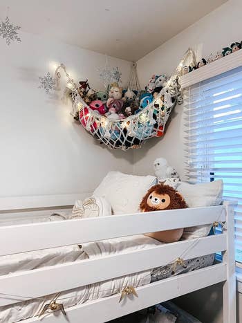 Promising review: "SO cute, SO high quality. My partner and I own a lot of stuffed animals. They were taking over the entire house. Stuffies EVERYWHERE! I was not expecting this to be so beautiful and sturdy in person, and I couldn’t be happier! I love that it came with a string light and star stickers, too. Absolutely precious. I don’t have kids, but I’m a kid at heart, and this was everything I could hope for! It saves us so much room, and it looks so nice! It’s high-quality, thick material. I love that it comes in my favorite shade of gray, and it holds a stupendous amount of plushies with no issues." —Skye