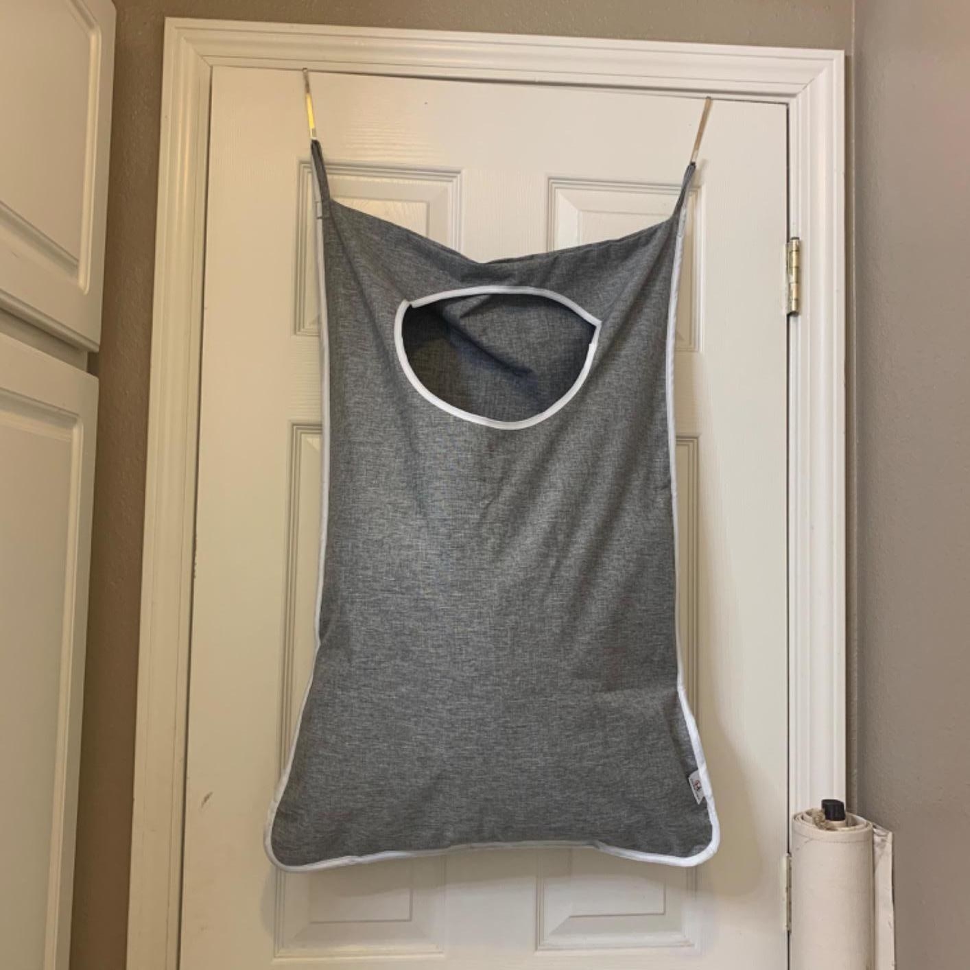 Promising review: "We've been using this for a while now. Our bathroom layout is too narrow for a traditional hamper, but we wanted something near the shower. This can definitely hold a full load of laundry. The design makes it so it doesn't bulge out so much. It keeps its lay-flat design. The zipper is borderline genius. We put a laundry basket underneath and unzip to transfer the laundry. Nothing ever gets stuck since the zipper is the full length of the bottom. Even with a large load of laundry, the zipper slides easily. It has not pinched or gotten caught on any of our clothes. Helpful." —Leah Batchelor