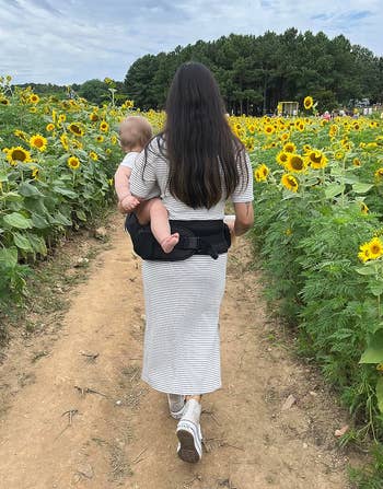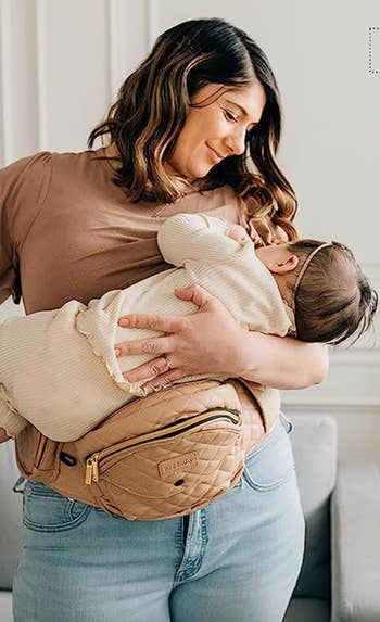 Promising review: "Seriously a lifesaver (or at the very least a lower back-saver). Took this on an international trip with my toddler and used it to carry them around any time they didn't want to be in the stroller. The pockets are so spacious — I was able to use this instead of a purse and fit a Ziplock bag with a couple of diapers, wipes, a changing mat, and a spare onesie, as well as my phone, cash, and cards. I cannot tell you how helpful it is to not have a giant diaper bag to contend with when you're trying to change your squirmy toddler in an airplane bathroom the size of a broom closet. It's not a hands-free solution (obviously), but I much prefer it over bulky traditional baby carriers with their million straps and buckles. My one caveat is that if you're a person on the thinner side, you'll probably need someone else to help you pull the strap tight enough for the carrier not to slide down. A good alternative I found was to tie a sweatshirt around my waist and then buckle the carrier on top of that." —A Moff