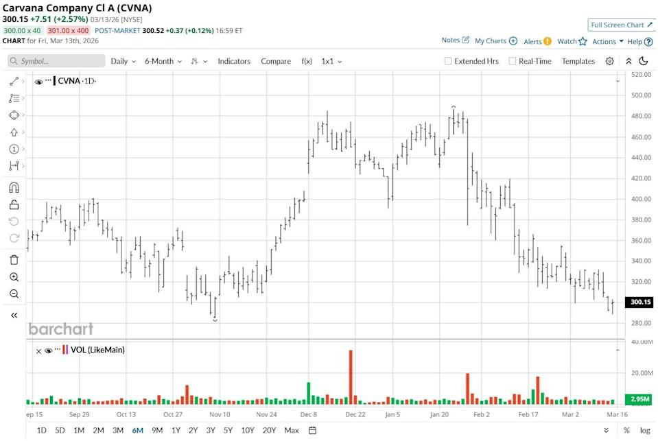 Carvana (CVNA) shares closed in the green on March 13 after the online used car retailer announced a 5-for-1 forward stock split — its first since inception in 2012. The announcement arrives just weeks after the company reported market-beating results for its Q4 on higher-than-expected vehicle sales. Carvana stock has still been in a sharp downtrend amid broader market weakness. At the time of writing, it’s down about 38% versus its year-to-date high in late January. How the Microsoft Stock Correction Created a $4K Options Opportunity Microsoft Is Racing to Beat Claude Cowork. A Big Catalyst for MSFT Stock Is Coming May 1. Stocks Erase Early Gains on Iran War Anxiety Get exclusive insights with the FREE Barchart Brief newsletter. Subscribe now for quick, incisive midday market analysis you won't find anywhere else. While a stock split doesn’t change the fundamental valuation of a company, it’s often viewed as management’s “vote of confidence." By lowering the nominal price of its shares — moving it from north of $300 to roughly $60 only — Carvana is significantly lowering the barrier to entry for both retail investors and employees. This increased liquidity often invites higher trading volume that drives the stock price higher. Additionally, the timing is key; management noted the split follows a 2025 that saw all-time record for units and profitability, signaling leadership believes the company is poised for future growth. This makes CVNA shares super attractive to own in 2026. William Blair also reiterated its “Outperform” rating on Carvana shares on Friday. According to William Blair analysts, the split announcement aligns with CVNA’s broader mission of democratizing company ownership among its team members through its discounted Employee Stock Purchase Plan. The move reflects a maturing company that has successfully transitioned from survival mode to an industry leader in growth and operational efficiency, the analysts added. In a research note dated March 13, the investment firm also said Carvana’s underlying fundamentals (specifically its path toward 3 million annual units and improved EBITDA margins) remains the primary drivers for long-term value creation. According to Barchart, the put-to-call ratio on options contracts expiring mid-June is skewed to the upside as well, with the upper price of about $383 signaling potential for 27% upside over the next three months. Other Wall Street analysts agree with William Blair’s bullish view on Carvana, especially since its 14-day relative strength index (RSI) in the mid-30s signals that bearish momentum is now approaching exhaustion. The consensus rating on CVNA stock remains at “Strong Buy,” with the mean target of about $444 indicating potential upside of a little under 50% from here. This article was created with the support of automated content tools from our partners at Sigma.AI. Together, our financial data and AI solutions help us to deliver more informed market headline analysis to readers faster than ever. On the date of publication, Wajeeh Khan did not have (either directly or indirectly) positions in any of the securities mentioned in this article. All information and data in this article is solely for informational purposes. This article was originally published on Barchart.com