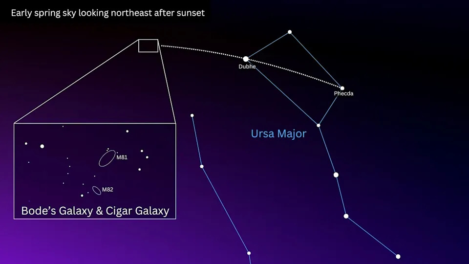 To find Bode's Galaxy, you first need to locate the famous Big Dipper asterism in Ursa Major, glowing in the northeastern sky in the hours following sunset in spring. Next, locate the bright stars Phecda, forming part of the base of the "bowl" of the dipper, and Dubhe, which forms its pouring tip. Draw an imaginary line between the two and follow it out into space for roughly the same distance again.