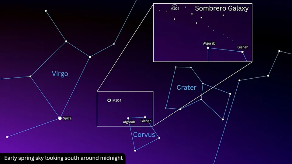 Grab your telescope and look out for a line of faint stars extending diagonally from Gienag above Algorab, which will lead you directly to the patch of sky containing M104! Check out our starhopping guide to finding the Sombrero Galaxy for a more detailed guide!