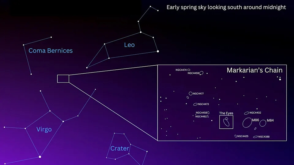Finally, we come to Markarian's Chain, a gorgeous string of galaxies whose ancient light shines out between the constellations of Leo, Virgo and Coma Berenices. The chain is named after Armenian astrophysicist Benjamin Egishevich Markarian, who found that several of these galaxies share similar motions and distances, indicating they belong to the same cluster