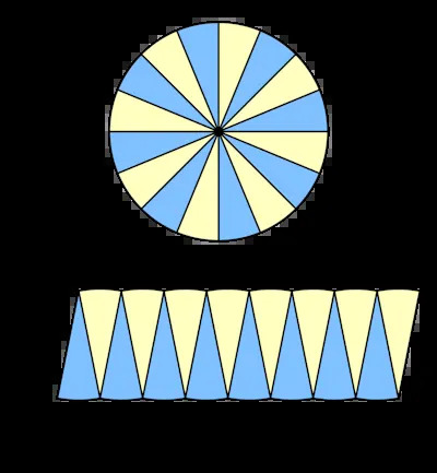 From the circumference of a circle we get the area. Cut a pizza into an even number of slices, alternately colored yellow and blue. Lay all the blue slices pointing up, and all the yellow slices pointing down. Since each color accounts for half the circumference of the circle, the result is approximately a strip of height r and width πr, or area πr2. The more slices we have, the better the approximation is, so the exact area must be exactly πr2.