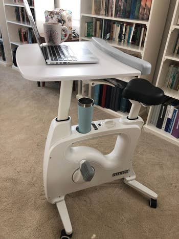Promising review: "WORTH EVERY PENNY! I've had this bike since October 2024, and honestly, it has been a game-changer. Between work and going back to school online full-time, it's been difficult for me to get low-impact cardio in since getting injured last year. I got this bike based on another reviewer's video of a woman being able to craft while using it, and I am so glad I did!The desk area itself is a great size, and I'm able to fit a laptop, keyboard, and mouse, and a small notebook, and sometimes I'll have my coffee up there as well. The seat is comfortable, but if you don't regularly ride a bike, your rear will be sore if you use it for extended periods of time. However, the effects do subside with consistent use. I love how the bike has wheels, which makes it easy to move, and it's not too heavy (I was able to assemble it by myself in less than half an hour). It pedals smoothly, and most importantly, it is QUIET! I added a few foam titles underneath to prevent the wheels from indenting the carpet, but even without them, this bike is SUPER QUIET. I live in an older apartment complex on the top floor, and I've asked my downstairs neighbors about any noise, and they said they only hear occasional footsteps and my cats wrestling." —Amazon Customer