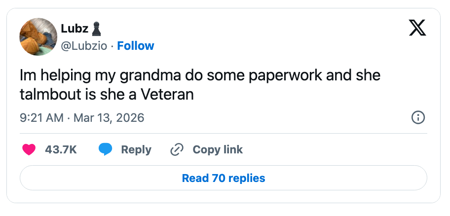 "Im helping my grandma do some paperwork and she talmbout is she a Veteran."