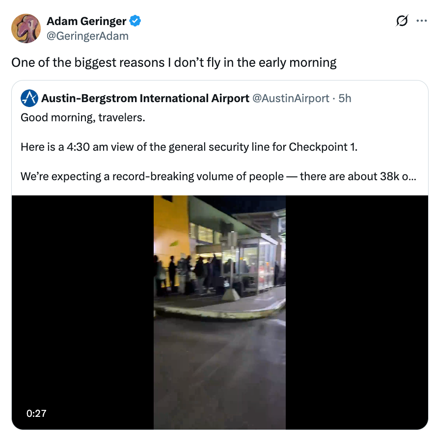 Good morning, travelers. Here is a 4:30 am view of the general security line for Checkpoint 1.We’re expecting a record-breaking volume of people — there are about 38k of you flying out today. Please arrive at least 2.5 hours prior to your flight’s departure for domestic. pic.twitter.com/4BSomFYRXz