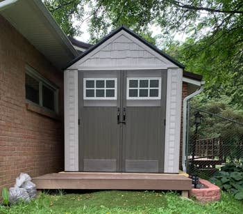 Promising review: "This item was just as described. It has six grounded outlets on a stake (which can also be wall-mounted) with a 50-foot cord that will support power tools. I recently assembled a resin shed behind my house, but couldn't really run power to it (pictured above, right). This was the perfect solution: I stationed it just outside the door, where it is accessible for whatever project or activity requires power. I love that there is a covered on/off switch on the back, so there is no power to the actual outlets until the stake is turned on. Perfect solution to my problem!" —Sara Weamer