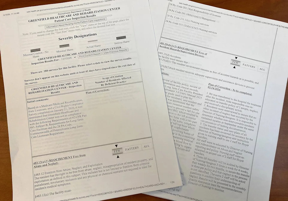 A Millcreek Township long-term care facility was cited twice by the Pennsylvania Department of Health after a patient suffered a broken hip, a torn wrist ligament and went into shock when a nursing assistant improperly tried to lift them out of bed. The resident was hospitalized for 10 days. Greenfield Healthcare and Rehabilitation, 1521 W. 54th St., was cited for failing to keep the patient free from abuse and neglect, and keeping them free of accident hazards. "I was lifted up and fell out of the lift," the resident told a state health inspector. "I hit the floor hard and got a terrible gash to the back of my head." The incident occurred Sept. 29 but the citations were issued following a Jan. 27 inspection, the results of which the state health department published on its website in early March. It is the latest in a series of incidents at Greenfield that have resulted in state health department citations. It received 19 citations in January, and six more in November and December. No fines or licensure status changes for the facility have been issued, according to the state health department website. Citations reported in the past year include: Repeatedly not having enough nurses or nursing assistants working. Not emptying a resident's bedside commode for more than 13 hours, despite that it was filled and its lid had fallen onto the floor. Residents lying in bed, soaked in their own urine, despite pressing a call bell for more than an hour. Not strongly enforcing the facility's nonsmoking policy for a patient on supplemental oxygen. Residents not given pain medications in a timely manner. Patient care staff working while wearing ear buds or talking on their cell phone. Greenfield officials did not return repeated calls seeking comment on the citations. The facility was cited in connection with the patient's fall because only one nursing assistant using a mechanical lift was attempting to transfer them from a bed to a wheelchair. State health codes require two people to assist when a resident can't help themselves. The employee involved received a disciplinary action and the staff was "re-educated" on the proper use of a Hoyer lift with two assistants, according to the inspection report. Greenfield officials did not explain in the report why only one staff member was attempting to lift the resident, but many of the 19 citations issued in January deal with a lack of staffing at the facility. Many, but not all, long-term care facilities in Erie County and across Pennsylvania are struggling to meet updated staffing levels for nurses and nursing assistants. Since July 2024, facilities have been required to provide at least 3.2 hours of direct, daily care to each resident. The staffing minimums for nursing assistants are now one for every 10 residents during the day, one for every 11 in the evening, and one for every 15 overnight. The minimums for licensed practical nurses are one per 25 residents during the day, one per 30 in the evening and one per 40 overnight. Also, there needs to be at least one registered nurse for every 250 residents. If you have a parent or spouse who will be moving into a long-term care facility, the Pennsylvania Department of Aging's long-term care ombudsman offered several tips for selecting a facility: Look at publicly available information such as health inspection reports and reviews. Talk with people in your community about their experiences with a facility. If at all possible, make sure you make a site visit and see the place for yourself. To contact your local ombudsman, call (814) 459-4581 ext. 593 or email them at ombudsman@gecac.org. Contact David Bruce at dbruce@timesnews.com or by calling 814-870-1736. (This story was updated to add new information.) This article originally appeared on Erie Times-News: PA Health Dept. cites Millcreek nursing home after patient fall