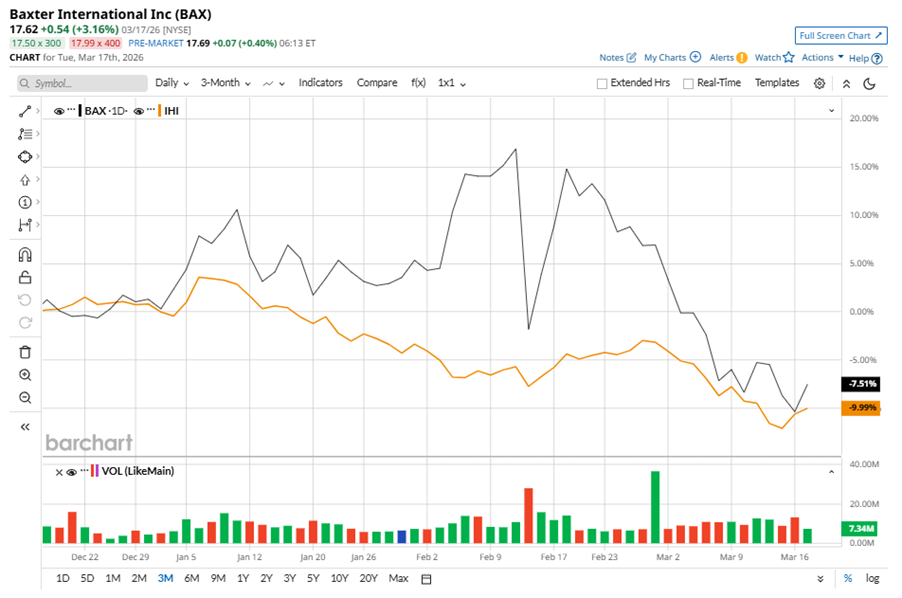 Baxter International Inc. (BAX), headquartered in Deerfield, Illinois, develops and provides a portfolio of healthcare products. With a market cap of $8.8 billion, the company develops, manufactures, and markets products and technologies related to hemophilia, immune disorders, infectious diseases, kidney disease, trauma and other chronic and acute medical conditions. The company's products are used by hospitals, kidney dialysis centers, nursing homes, rehabilitation centers, doctors' offices, and research laboratories. Companies worth $2 billion or more are generally described as “mid-cap stocks,” and BAX perfectly fits that description, with its market cap exceeding this mark, underscoring its size, influence, and dominance within the medical instruments & supplies industry. Baxter excels through diversified healthcare products and innovative expansions. Strategic acquisitions enhance its connected care solutions, while investments in new launches and geographic growth solidify its medical technology leadership. As Oracle Reveals Higher Restructuring Costs, Should You Still Buy ORCL Stock or Stay Far Away? Stop Fighting Time Decay: How Credit Spreads Change the Game for Options Traders Stocks Climb on Strength in Chip and Travel Stocks Tired of missing midday reversals? The FREE Barchart Brief newsletter keeps you in the know. Sign up now! Despite its notable strength, BAX shares have slipped 49.5% from their 52-week high of $34.92, achieved on Mar. 18, 2025. Over the past three months, BAX stock has declined 8.7%, outperforming the iShares U.S. Medical Devices ETF’s (IHI) 10.2% losses during the same time frame. Shares of BAX dipped 24.1% on a six-month basis and fell 49.4% over the past 52 weeks, notably underperforming IHI’s six-month losses of 7.3% and 6.5% over the last year. To confirm the bearish trend, BAX has been trading below its 50-day moving average since early March. The stock is trading below its 200-day moving average over the past year, with a minor fluctuation. Baxter's underperformance is attributed to unfavorable product mix, inventory adjustments, and higher manufacturing costs, with improvements expected in the second half of 2026. On Feb. 12, BAX shares tumbled 16% after reporting its Q4 results. Its adjusted EPS of $0.44 missed Wall Street expectations of $0.53. The company’s revenue was $3 billion, surpassing Wall Street forecasts of $2.8 billion. BAX expects full-year adjusted EPS in the range of $1.85 to $2.05. BAX’s rival, Becton, Dickinson and Company (BDX) has taken the lead over the stock, with 9.6% gains on a six-month basis and a 9.8% dip over the past 52 weeks. Wall Street analysts are cautious on BAX’s prospects. The stock has a consensus “Hold” rating from the 16 analysts covering it, and the mean price target of $20.08 suggests a potential upside of 14% from current price levels. On the date of publication, Neha Panjwani did not have (either directly or indirectly) positions in any of the securities mentioned in this article. All information and data in this article is solely for informational purposes. This article was originally published on Barchart.com