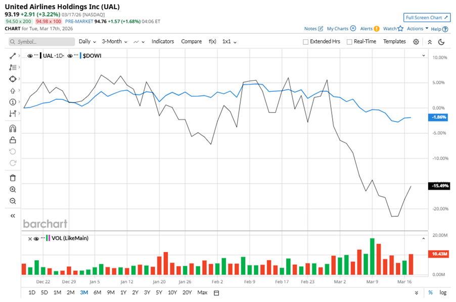 Chicago, Illinois-based United Airlines Holdings, Inc. (UAL) owns and manages airlines that transports people and cargos serving customers worldwide. With a market cap of $29.2 billion, the company also offers catering, ground handling, flight academy, and maintenance services for third parties. Companies worth $10 billion or more are generally described as “large-cap stocks,” and UAL perfectly fits that description, with its market cap exceeding this mark, underscoring its size, influence, and dominance within the airlines industry. UAL's extensive route network, strategic hubs, and loyalty program drive its competitive edge in global aviation, facilitating high-volume international and long-haul flights. As Oracle Reveals Higher Restructuring Costs, Should You Still Buy ORCL Stock or Stay Far Away? Stop Fighting Time Decay: How Credit Spreads Change the Game for Options Traders Stocks Climb on Strength in Chip and Travel Stocks Get exclusive insights with the FREE Barchart Brief newsletter. Subscribe now for quick, incisive midday market analysis you won't find anywhere else. Despite its notable strength, UAL slipped 21.8% from its 52-week high of $119.21, achieved on Jan. 7. Over the past three months, UAL stock has declined 15.5%, underperforming the Dow Jones Industrials Average’s ($DOWI) 2% dip during the same time frame. Shares of UAL fell 11.7% on a six-month basis, underperforming DOWI’s six-month gains of 1.8%. However, in the longer term, the stock climbed 26.7% over the past 52 weeks, outperforming DOWI’s solid 13% returns over the last year. To confirm the bearish trend, UAL has been trading below its 200-day moving average since early March. The stock has been trading below its 50-day moving average since late February. UAL's recent underperformance is attributed to the Middle East conflict, which drove up jet fuel costs and lowered travel demand. On Jan. 20, UAL shares closed down more than 4% after reporting its Q4 results. Its revenue was $15.40 billion, surpassing analyst estimates of $15.38 billion. The company’s adjusted EPS of $3.10 beat analyst estimates by 5.4%. UAL’s rival, Delta Air Lines, Inc. (DAL) has taken the lead over the stock, with 10.2% gains on a six-month basis and 38.3% uptick over the past 52 weeks. Wall Street analysts are bullish on UAL’s prospects. The stock has a consensus “Strong Buy” rating from the 25 analysts covering it, and the mean price target of $134.40 suggests a notable potential upside of 44.2% from current price levels. On the date of publication, Neha Panjwani did not have (either directly or indirectly) positions in any of the securities mentioned in this article. All information and data in this article is solely for informational purposes. This article was originally published on Barchart.com