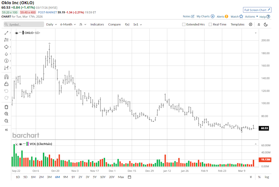 Oklo (OKLO) stock inched higher on Tuesday after the company said its subsidiary Atomic Alchemy has received its first-ever materials license from the Nuclear Regulatory Commission (NRC). At its intraday peak, OKLO was seen trading above its 20-day moving average (MA), indicating a potential shift in short-term momentum from bearish to bullish. Crude Oil Rallies as Iranian Attacks Disrupt Middle Eastern Supplies Nat-Gas Prices Gain as Iran Attacks Key Energy Infrastructure Crude Oil Prices Gain as Iran Renews Attacks on Middle East Energy Infrastructure Get exclusive insights with the FREE Barchart Brief newsletter. Subscribe now for quick, incisive midday market analysis you won't find anywhere else. Despite today’s gains, OKLO shares remain down over 40% versus their January high. The NRC license is a watershed moment for OKLO stock as it validates the company’s path toward commercial isotope production. Specifically, this materials license enables the NYSE-listed firm to handle and process isotopes at its Idaho Radiochemistry Laboratory. While OKLO is primarily known for its Aurora power plants, this approval unlocks an immediate, secondary revenue stream in the medical and industrial isotope market. By proving it can navigate the NRC’s rigorous safety and security standards, the company based out of Santa Clara, California, has de-risked its regulatory profile, boosting institutional confidence in its ability to eventually license its larger power reactors. While OKLO reported a wider-than-expected per-share loss of $0.27 for its fourth financial quarter (Q4) today, the underlying details remain significantly positive for long-term investors. The company finished 2025 with a fortress balance sheet, boasting over $1.1 billion in cash and equivalents, which provides a multi-year runway for data center deployment. As of early 2026, the nuclear energy firm has established a remarkable 18GW pipeline that includes a number of high-density users like Meta Platforms (META). It’s partly why options traders are currently pricing in significant upside in OKLO shares. According to Barchart, contracts expiring mid-June have the upper price set at about $70, signaling the company’s share price could climb another 30% over the next three months. Wall Street analysts seem to share options traders’ optimism on OKLO stock as well. The consensus rating on this nuclear-tech firm sits at “Moderate Buy” currently with the mean target of about $108 indicating potential upside of nearly 80% from here. This article was created with the support of automated content tools from our partners at Sigma.AI. Together, our financial data and AI solutions help us to deliver more informed market headline analysis to readers faster than ever. On the date of publication, Wajeeh Khan did not have (either directly or indirectly) positions in any of the securities mentioned in this article. All information and data in this article is solely for informational purposes. This article was originally published on Barchart.com