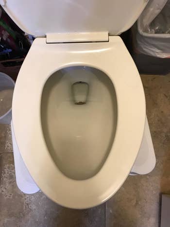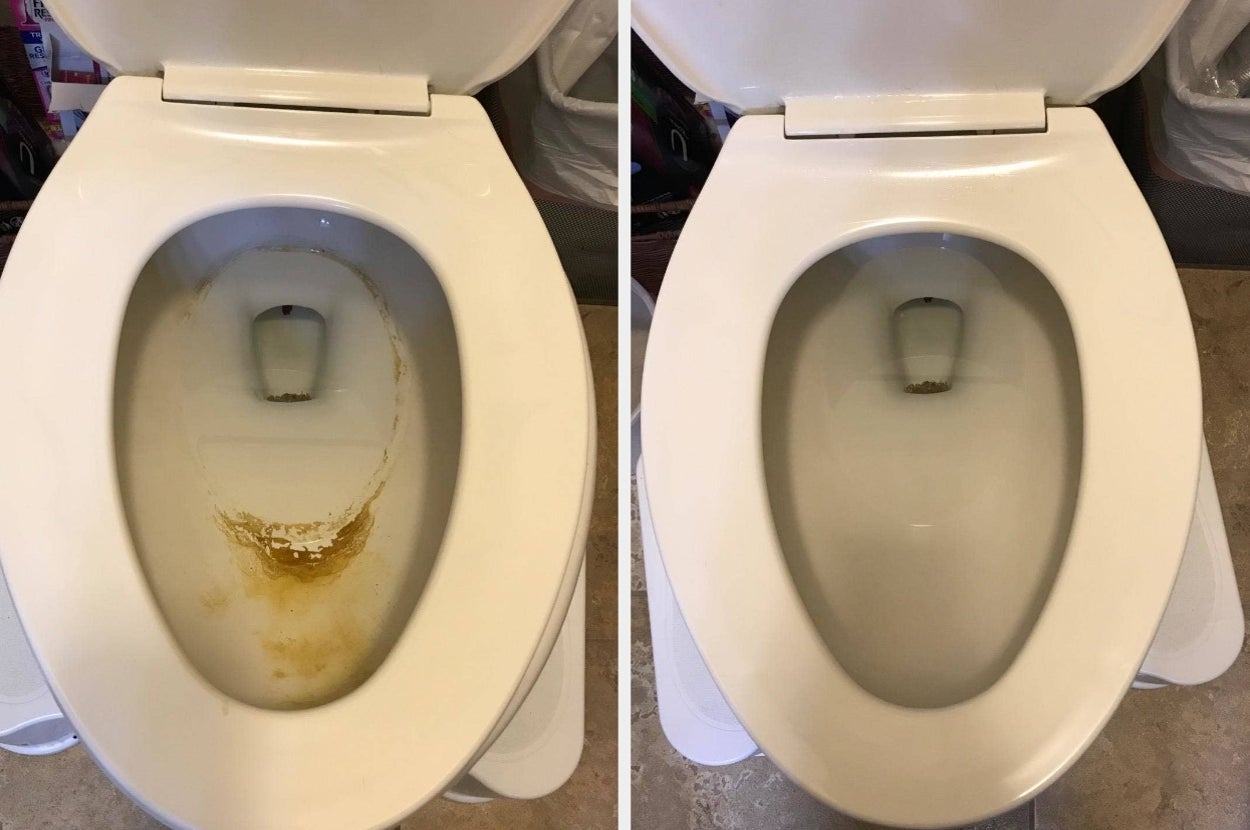 Promising review: "I have very hard water that leaves hard-water buildup and nasty stains. It’s embarrassing to have guests over because the toilets are so gross! I have tried so many products and cleaning solutions — from natural essential oils to harsh chemicals so strong I was lightheaded for the rest of the day. Well, I tried out this pumice stone after reading about it in a BuzzFeed article, and honestly, the hype is real! It does take some elbow grease, but the after picture is from only 20 minutes of scrubbing, light enough that I didn’t break a sweat! The stone does get used up, but I think this one should last me a couple of years at least. So if you have embarrassing toilets, try this!" —Stephanie Ray