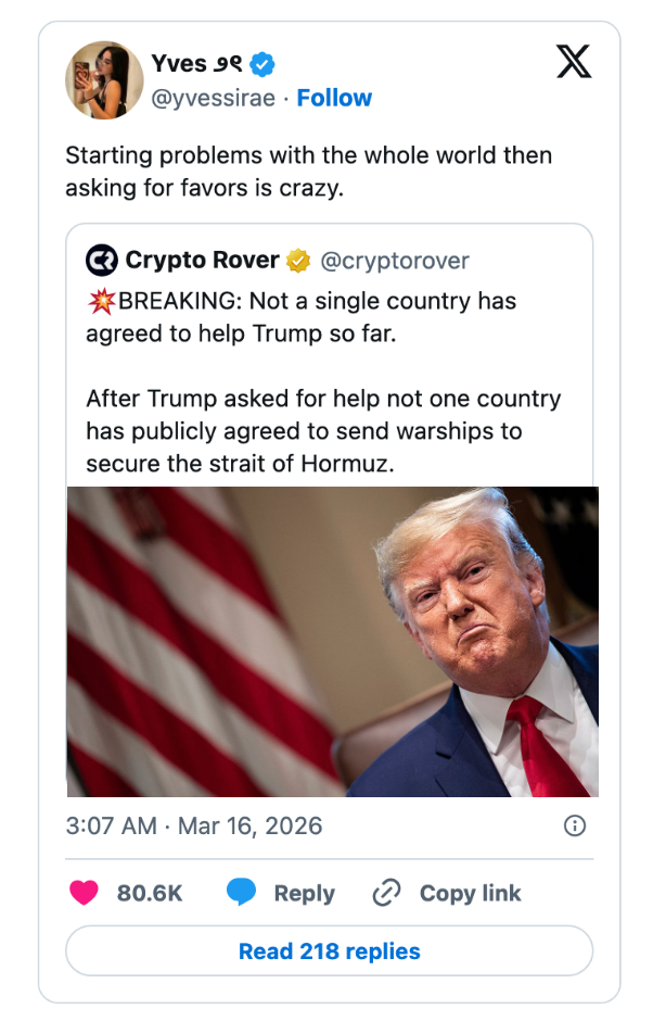 Trump: "Maybe we shouldn't be there at all. We have a lot of oil."Trump says other countries should protect the Strait because "we have a lot of oil." After starting a war, disrupting global oil - he's now asking why the US is even there pic.twitter.com/eM2CGg7isj