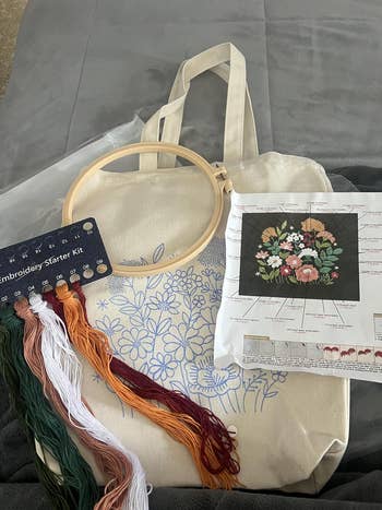 This embroidery kit includes a canvas tote bag and printed botanical pattern, an embroidery hoop, a pack of multi-colored embroidery threads, two embroidery needles, and instructions.