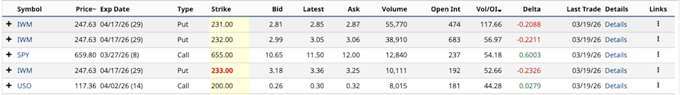Among ETFs, IWM had three of the five highest Vol/OI (volume-to-open-interest) ratios yesterday, all of them puts; all OTM (out-of-the-money). Clearly, many long-time IWM holders were looking to protect the downside in these uncertain times. Perfectly understandable.