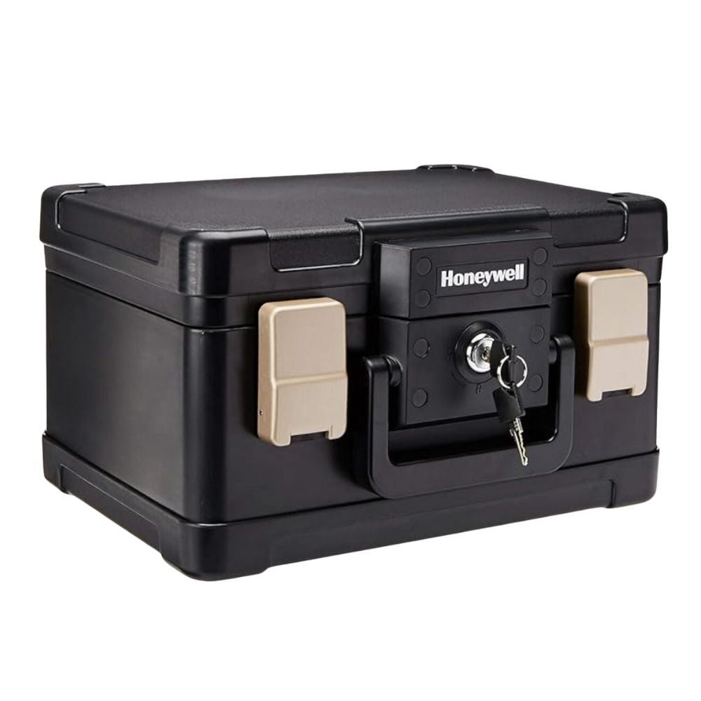 This safety box is fireproof and waterproof; it can hold letter and A4 size documents lying down.
